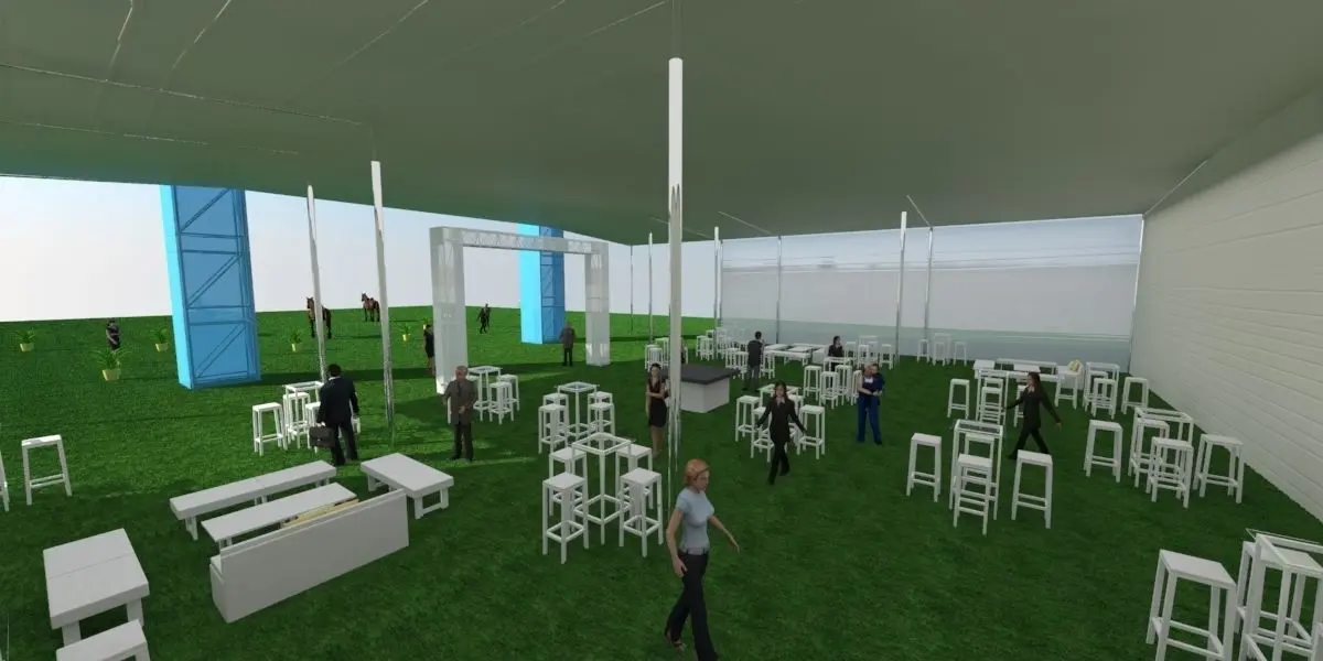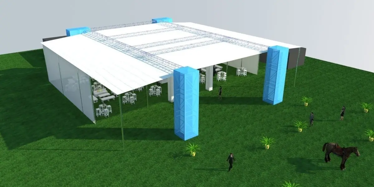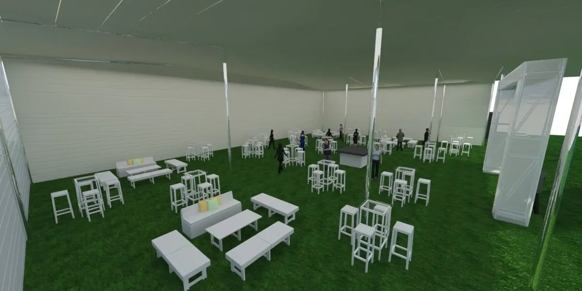 Open awning design for 500 attendees 6 meters high and lounge rooms with high tables