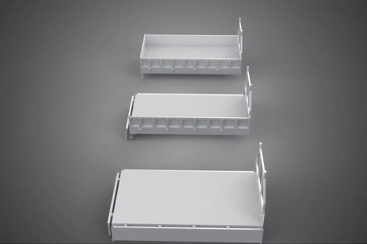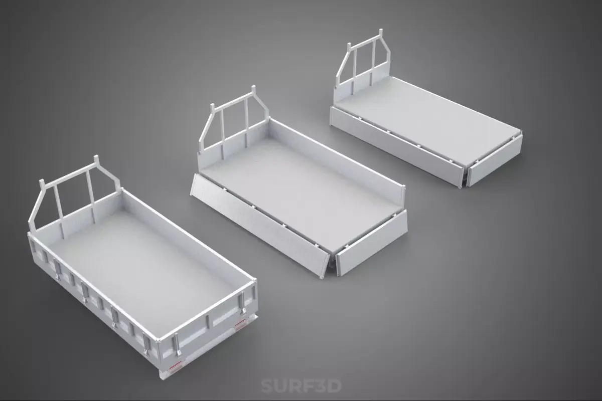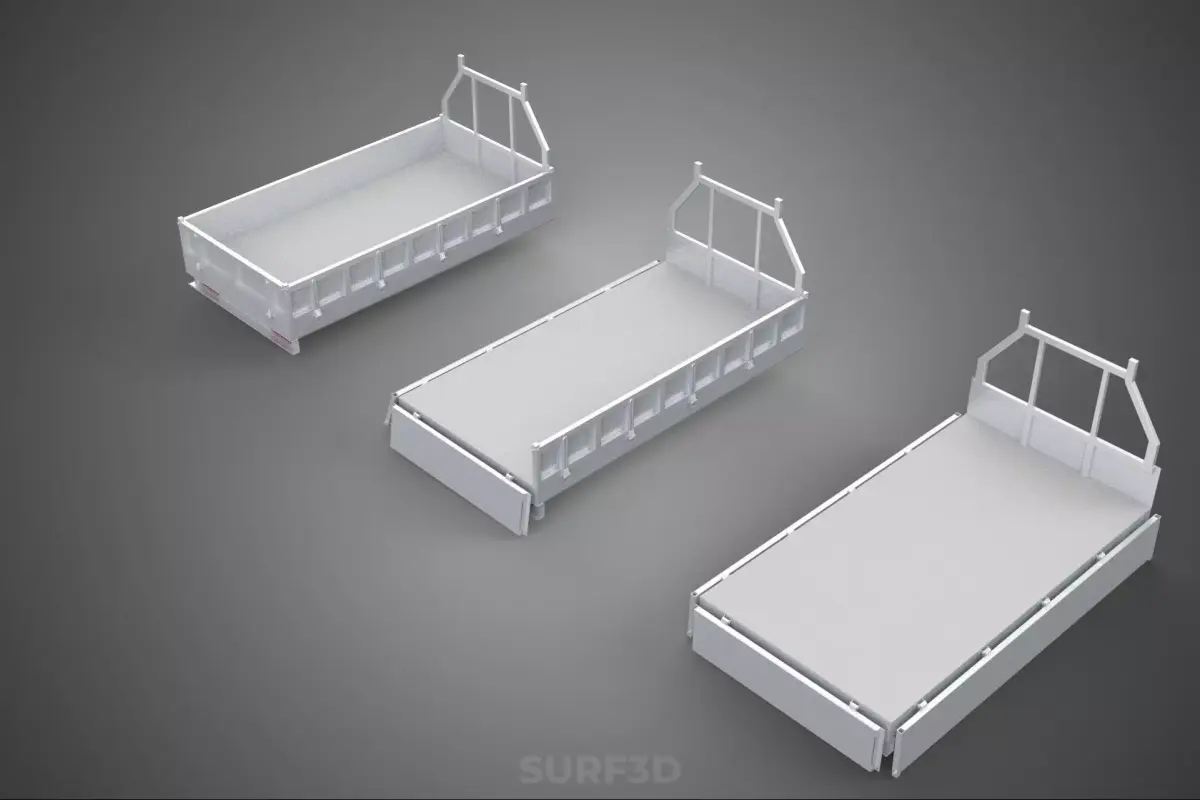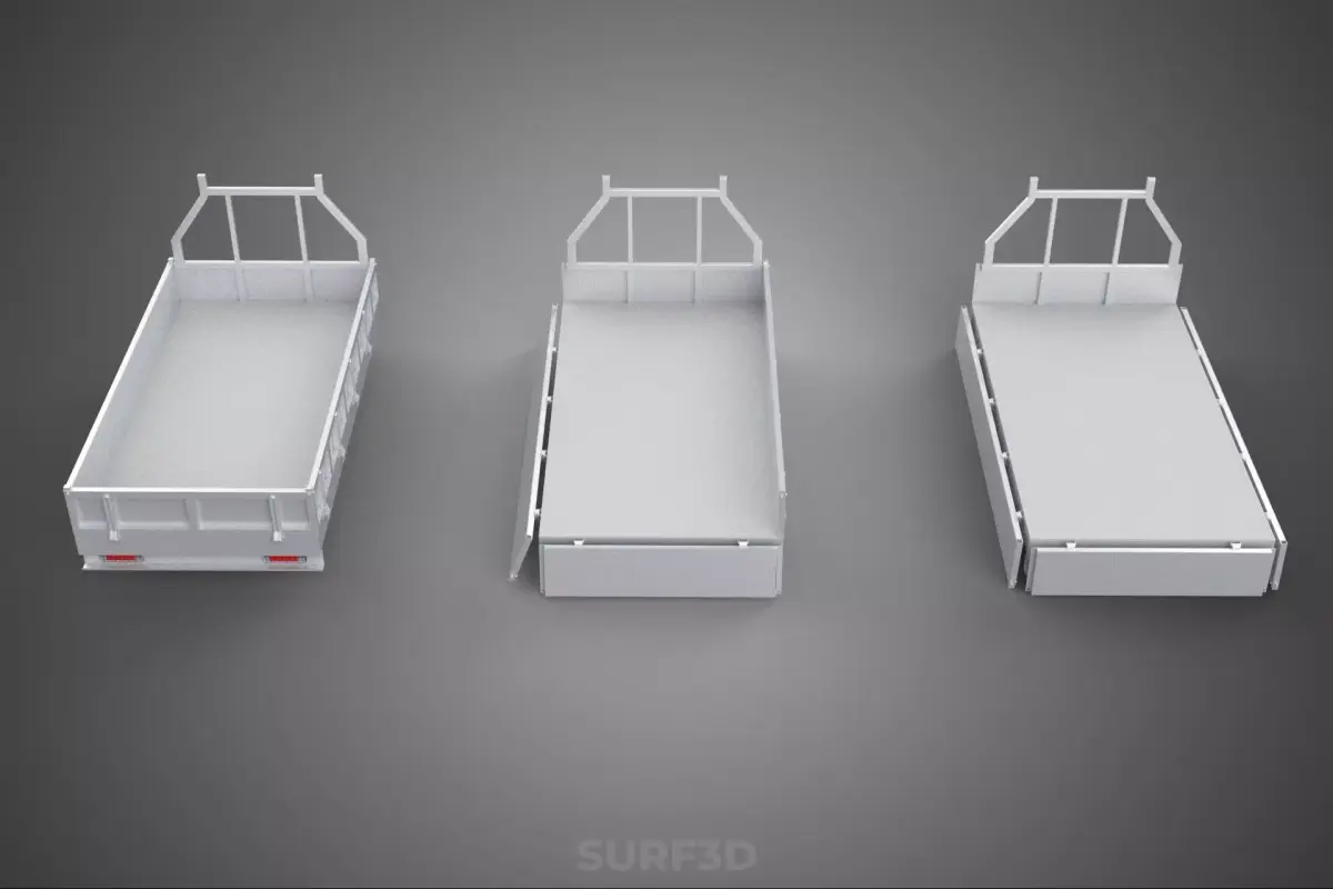 - Modular Configuration ('Open and Closed Truck Back'): This designation highlights the system's ability to transition between different states. In its closed configuration, it functions as a conventional truck bed with all side panels (including a headboard and tailgate) forming a contained volume, suitable for securing loose or smaller items. The open state is achieved by dropping or removing some or all of these side panels, effectively converting the bed into a flat deck. This allows for the transport of wider or irregularly shaped loads that would otherwise be impossible to carry within a standard bed.