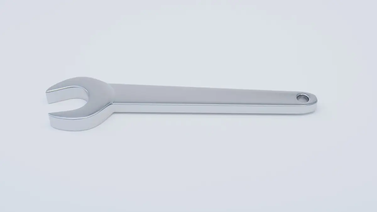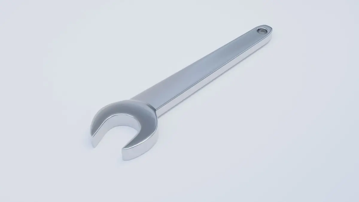 Free Open Ended Wrench 3D model that was made using Blender. This 3D model is free to download and use. It is a simplified open-ended wrench. It has the wrench end on one side and a simple hole at the back. It is fully completed with PBR textures, file exports, UV unwrapping, and render lighting and camera setups.