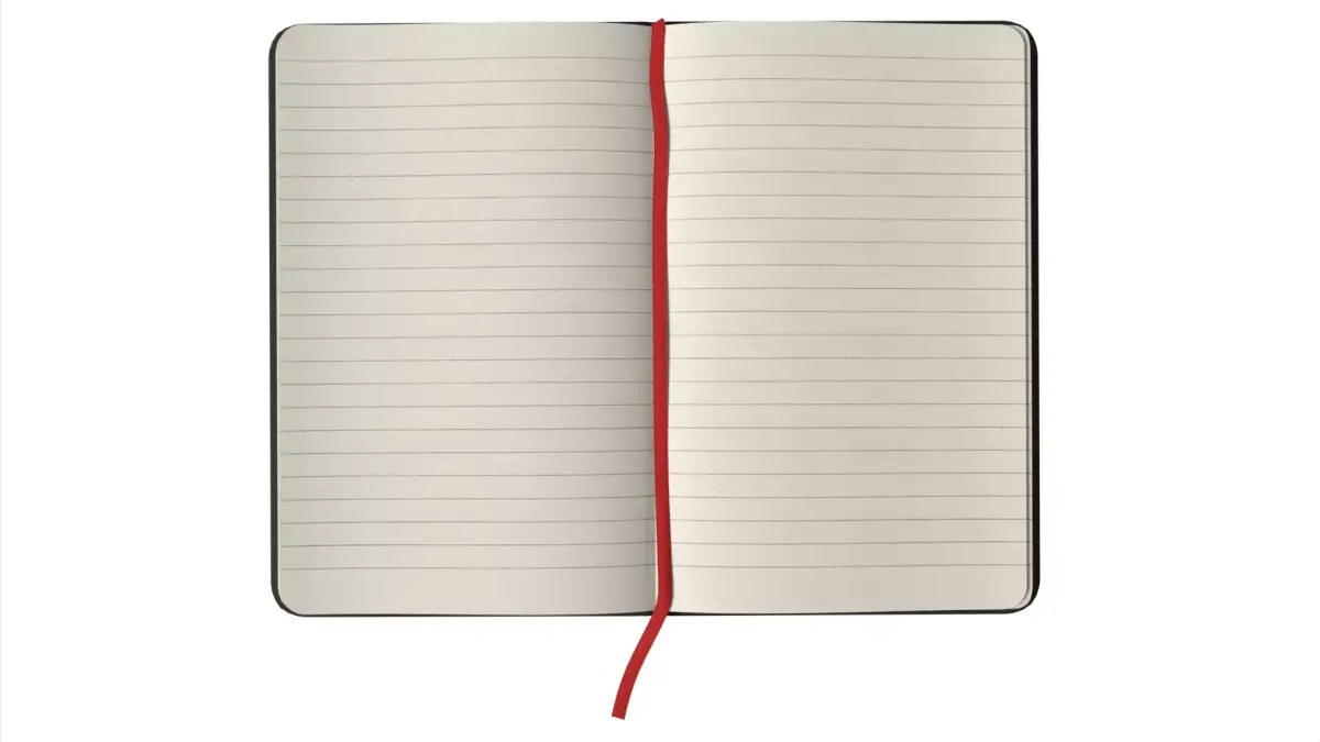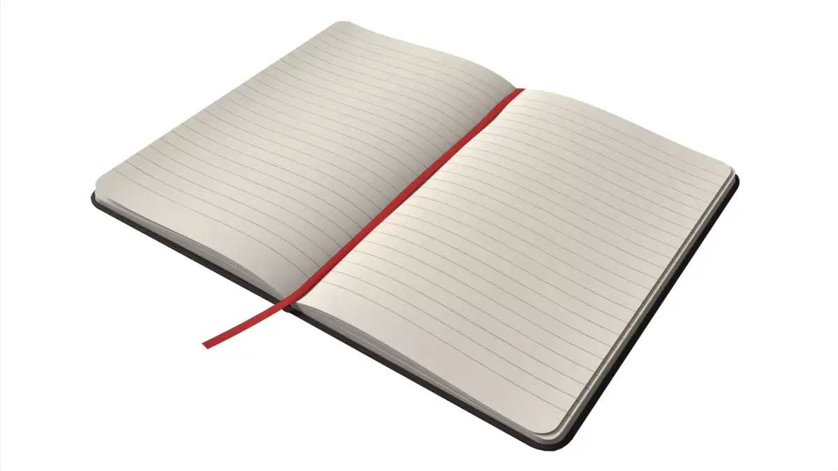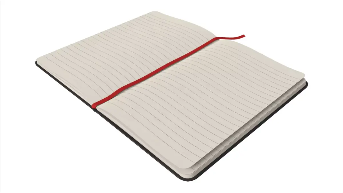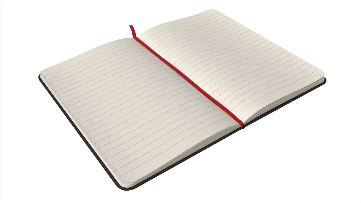 High-quality photorealistic 3D model of an open notebook, featuring detailed lined paper and realistic page deformation.