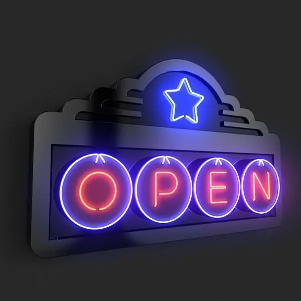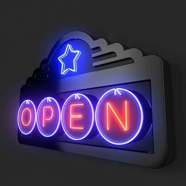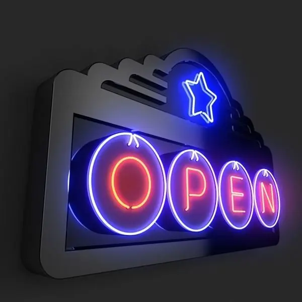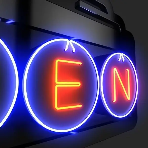 A highly detailed 3D Neon Open Sign created for use in broadcast, high-res film close-ups, advertising, design visualization, etc. Created in Maya 2008 and rendered with mental ray.