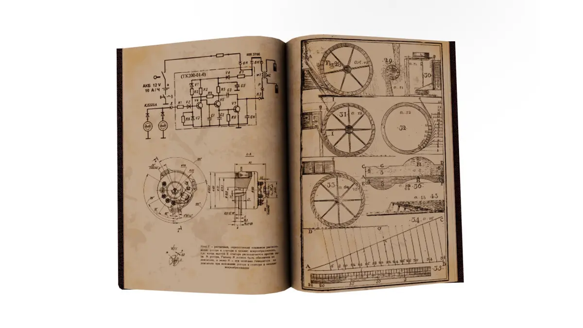 This is a low-poly 3D model of an open vintage book displaying intricate technical schematics and mechanical blueprints, ideal for use in historical, steampunk, industrial, and sci-fi themed scenes. The model is game- and render-ready, with clean topology and efficient UV mapping. Perfect for VR/AR, real-time applications, or as an atmospheric prop in games, animations, and architectural visualizations. Real-world size
