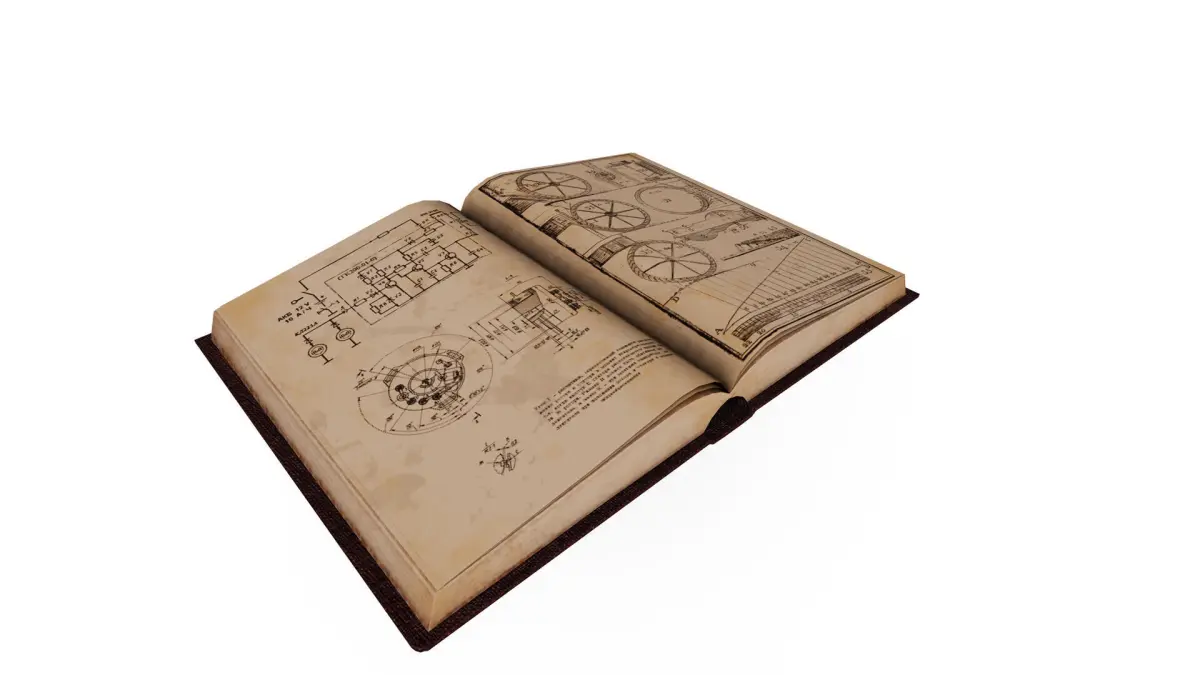 The model includes a stylized, weathered texture that gives the book a realistic antique feel, complete with aged paper, ink diagrams, and a clothbound cover.Model Specifications: