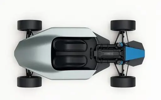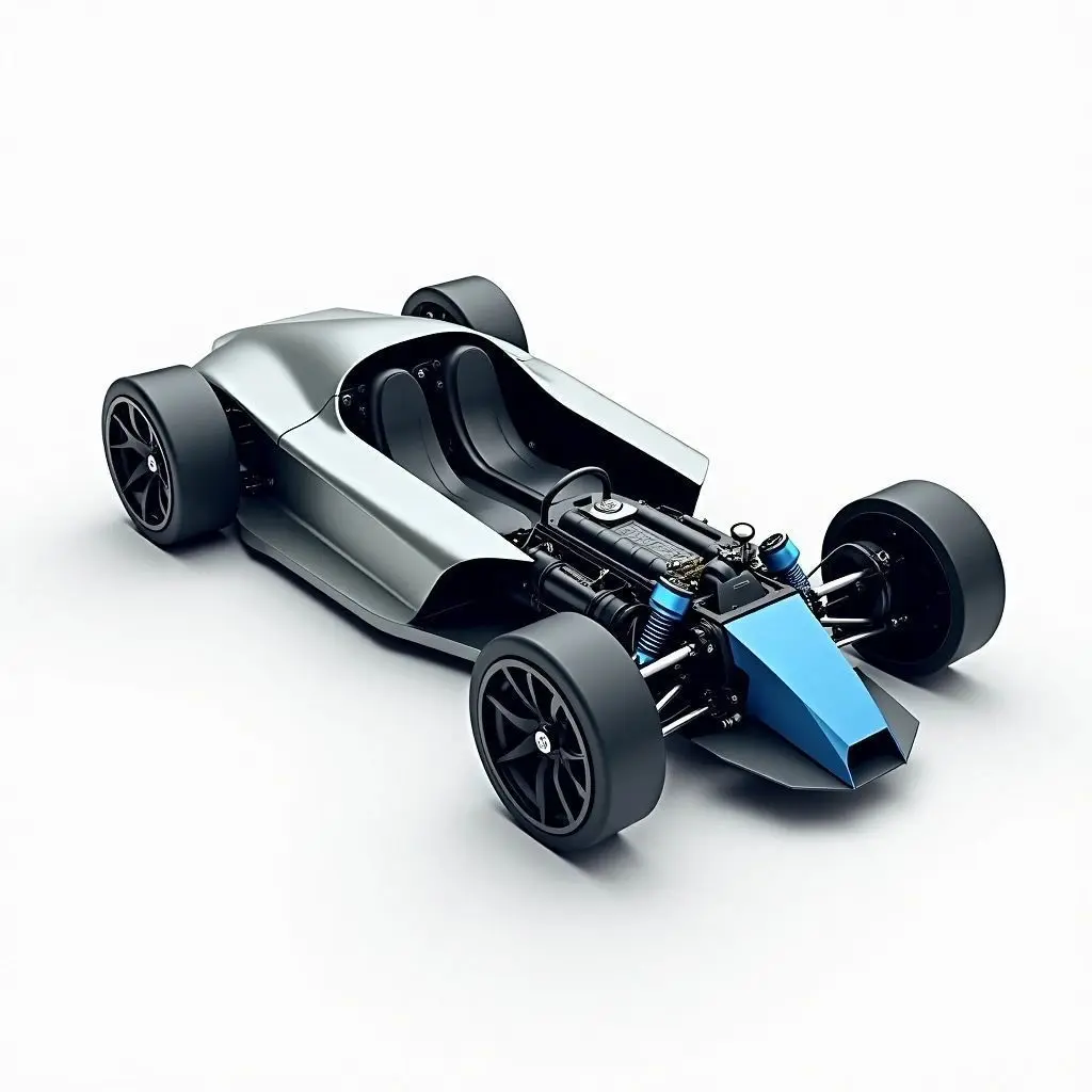 A sleek and detailed 3D model showcasing the exposed chassis of a futuristic, open-wheel sports car. The core bodywork is rendered in a smooth, matte metallic grey, while key mechanical components, particularly the suspension and engine elements, are highlighted with vibrant blue accents. The car features large, dark racing wheels with low-profile tires, a minimalist single or dual-seat cockpit, and visible suspension components, emphasizing its performance-oriented design. The model is presented against a clean white background, drawing focus to its intricate engineering and modern, high-tech aesthetic. This model is ideal for sci-fi racing games, concept vehicle visualizations, engineering simulations, or any project requiring a cutting-edge and stripped-down performance machine.