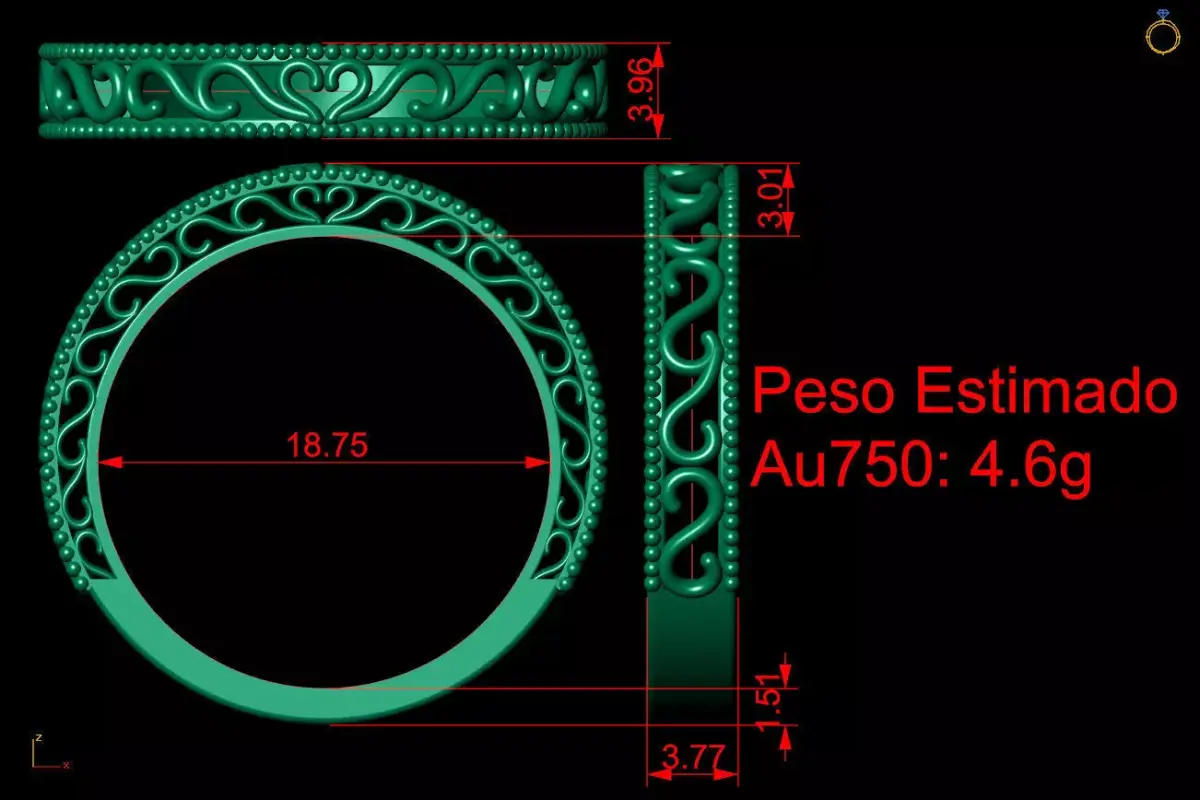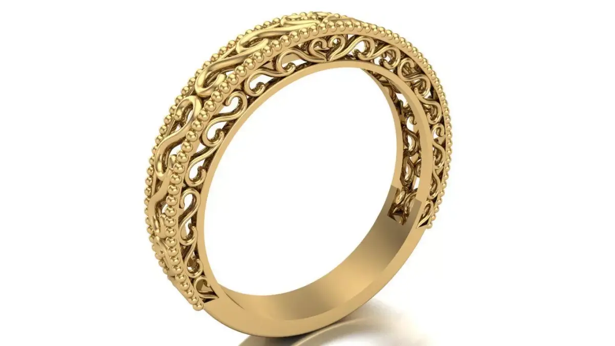 Ring featuring an openwork structure with continuous symmetrical arabesques, framed by two polished bead rows running along the entire circumference.The design balances lightness and volume through its interplay of curved lines and open spaces.Estimated weight: 4.6 g in Au750.All measurements of the piece are shown in the image in millimeters.