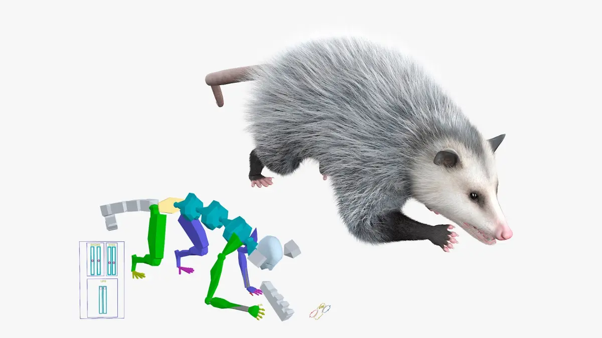 Opossum Eating Fur Animated Rigged is fully rigged and is ready to be animated. You can easily position it the way you need or animate it the way your project requires using helpers in 3D Studio Max. See the turntable to get an idea of how rigging works.