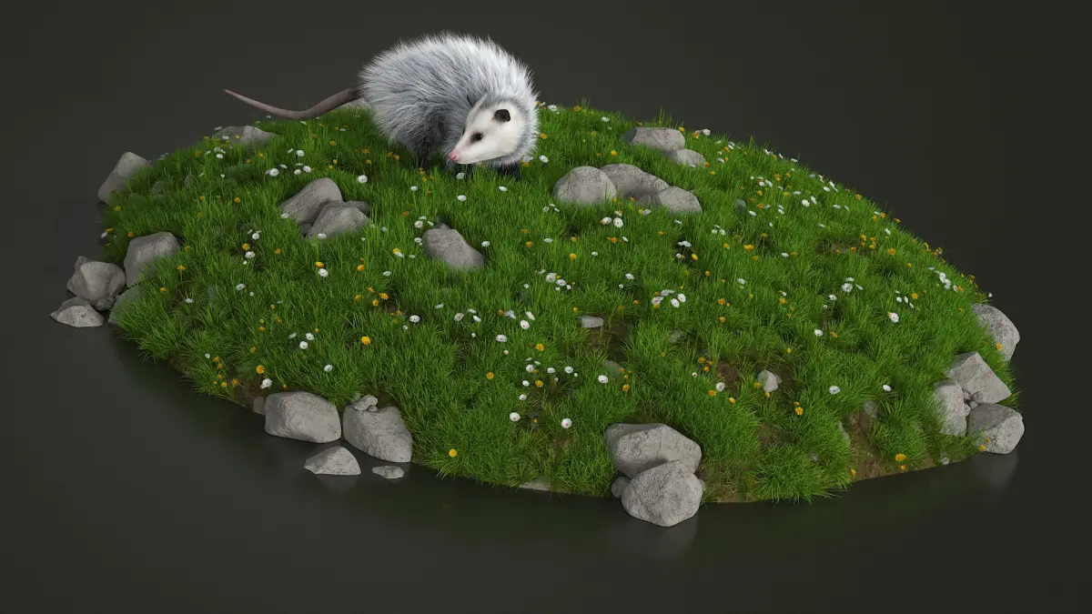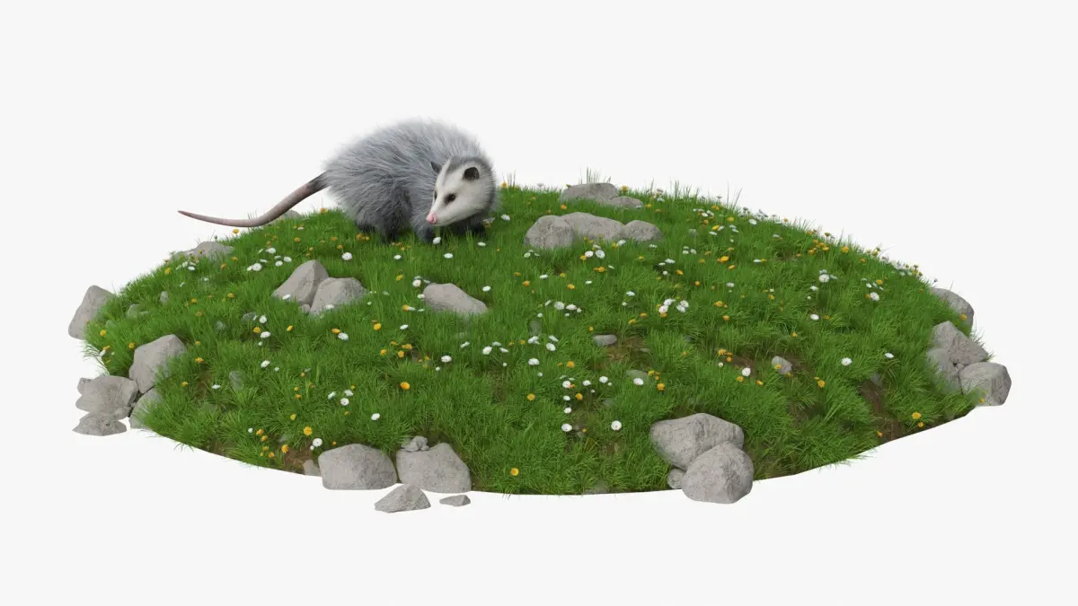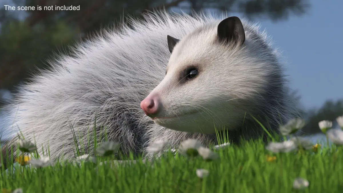 Opossum on Meadow with Blooming Flowers Fur is a three-dimensional model of opossum, capturing the unique features and appearance of this nocturnal marsupial.