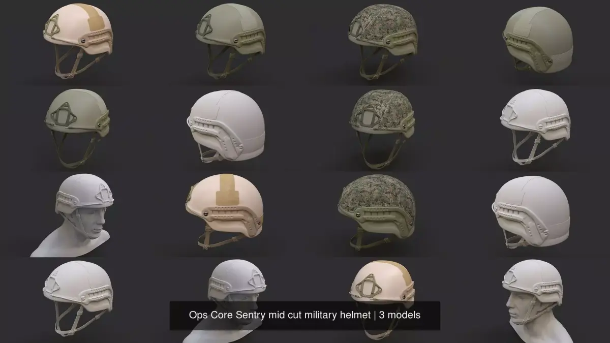 This is collection of my Ops Core Sentry mid cut military helmet series. They come in Urban tan, Black, Foliage green and Foliage green with cover with marpat pattern.You can buy them individualy but in this collection you pay three and get four (you can use CGtrader discounts, or my discount codes to get it for less money).