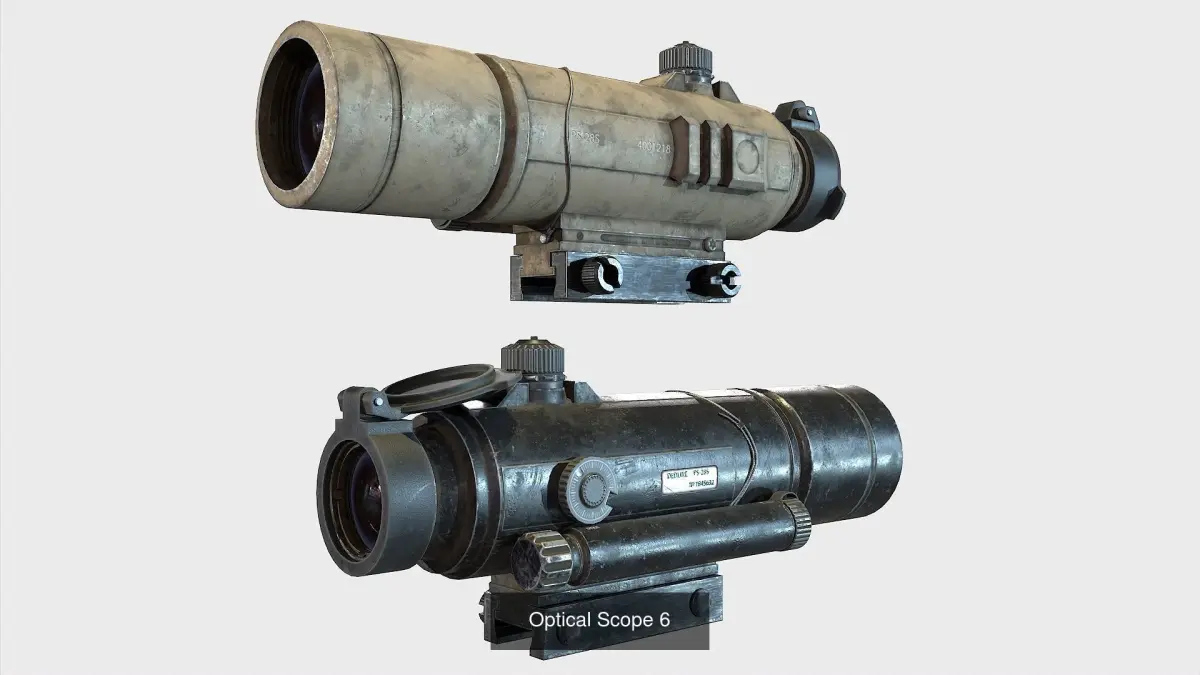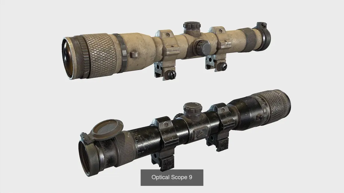 Optical Scope Collections 2.Includes 5 models of optical sights intended for PBR.Hi quality texture resolution is 4096x40962 texture set, black polymer and desertAlbedo,Normal,Metallic,Roughness,AO.opacity,(emissive optional)