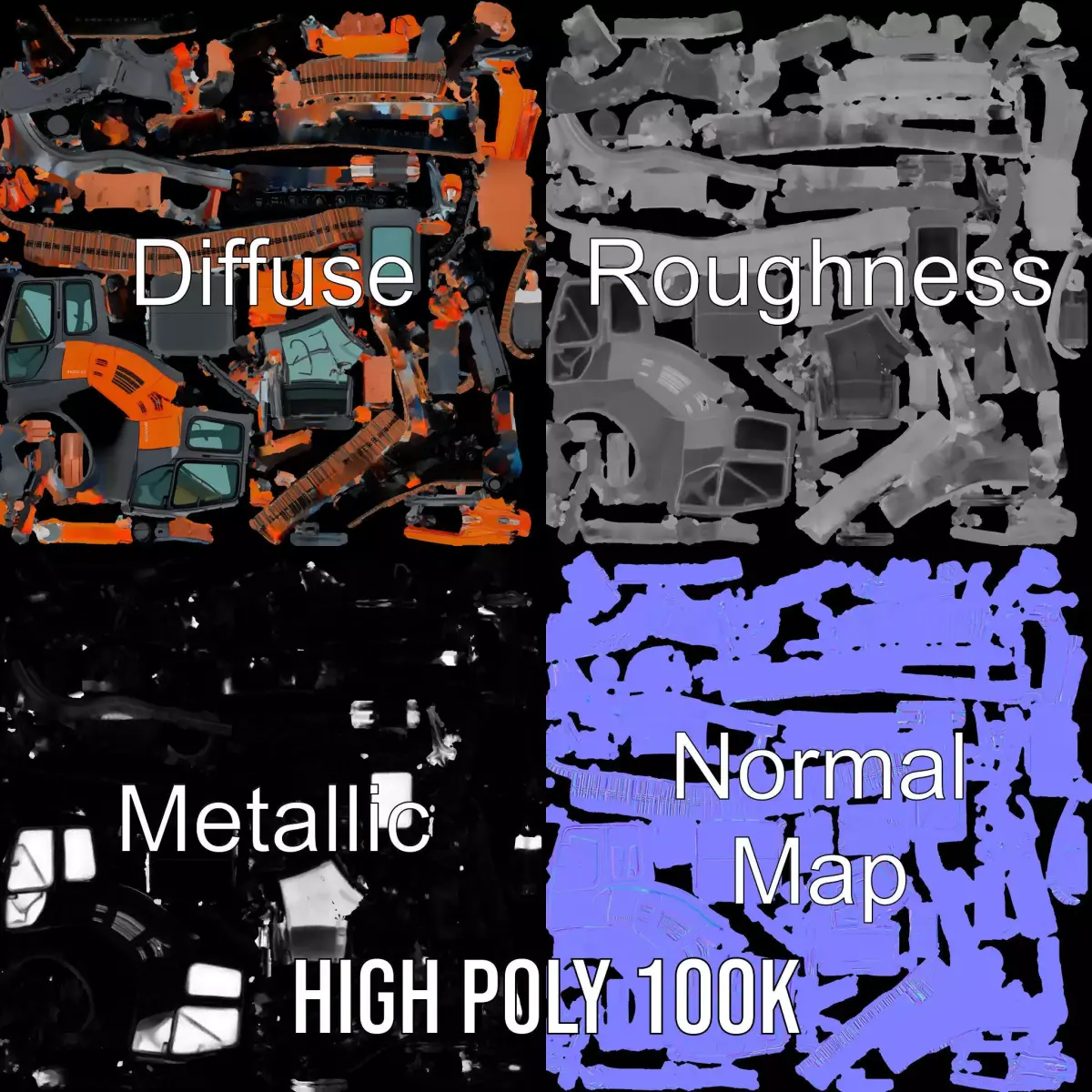 This highly detailed Orange Excavator model pack is perfect for construction and industrial scene setups. Each model has 3 levels of detail: low-poly (1000 triangles for mobile), middle-poly (10,000 triangles for environment), and high-poly (100,000 triangles), which allows for the use of this model in production rendering (such as 3ds Max, Maya, Cinema4D, Blender, Vray/Corona/Cycles and all others), game engines (Unity and Unreal compatible), and interactive presentations, providing a choice of detail based on the LOD System principle. Ideal for use in construction simulations, architectural visualizations, and training applications. The model's textures are PBR, Diffuse, NormalMap, and reflection/roughness/metallic, which are suitable for any modern rendering engine. All models are accurately unwrapped and have no overlapping UV. All textures are 4096*4096 in size. If you like this model, please leave a like and comment!