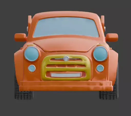 It includes distinct cyan-tinted headlights and windows, providing a sharp color contrast against the warm orange tones of the chassis.