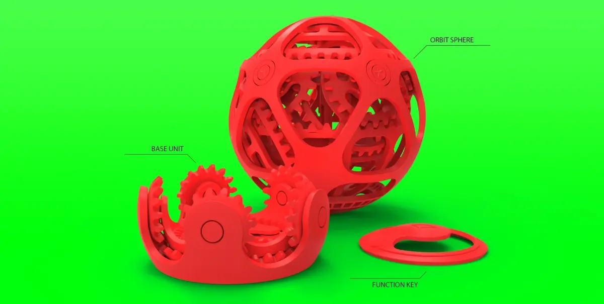 PARTS:Orbit is made up of two main units: the Base Unit, and the Orbit Sphere. The Orbit Sphere can work independently – by inserting the key into any of the three key-slot locations and turning, Orbit will come to life. Two speeds can be achieved depending on the chosen slot. When placing The Orbit sphere on the Base unit, and twisting the key, the entire sphere will spin.