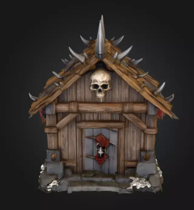 What sets this orc dwelling apart is the imposing skull ornament mounted prominently on the exterior. The skull—whether from a beast or an enemy—serves as a symbol of power, warning outsiders of the tribe’s ferocity and marking the dwelling as a place of strength. This detail adds not only a visual focal point but also a narrative layer, hinting at the orc culture’s reliance on trophies, intimidation, and ancestral spirit worship.