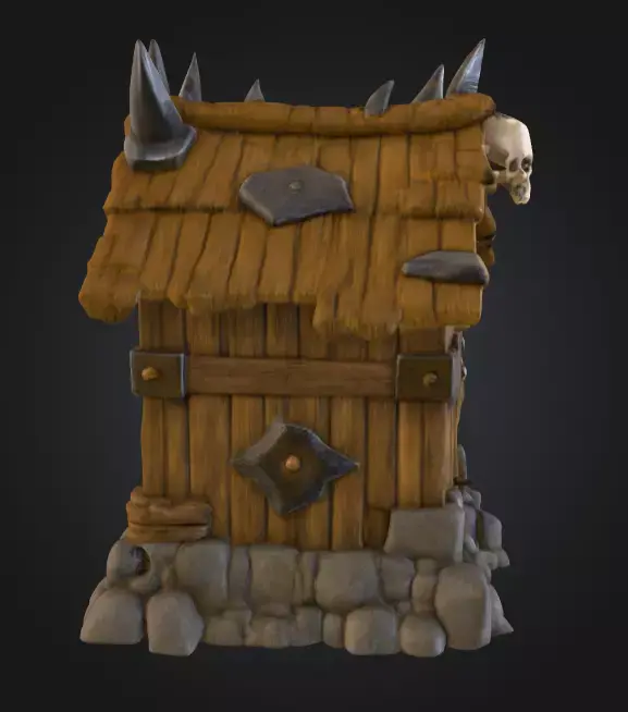 What sets this orc dwelling apart is the imposing skull ornament mounted prominently on the exterior. The skull—whether from a beast or an enemy—serves as a symbol of power, warning outsiders of the tribe’s ferocity and marking the dwelling as a place of strength. This detail adds not only a visual focal point but also a narrative layer, hinting at the orc culture’s reliance on trophies, intimidation, and ancestral spirit worship.