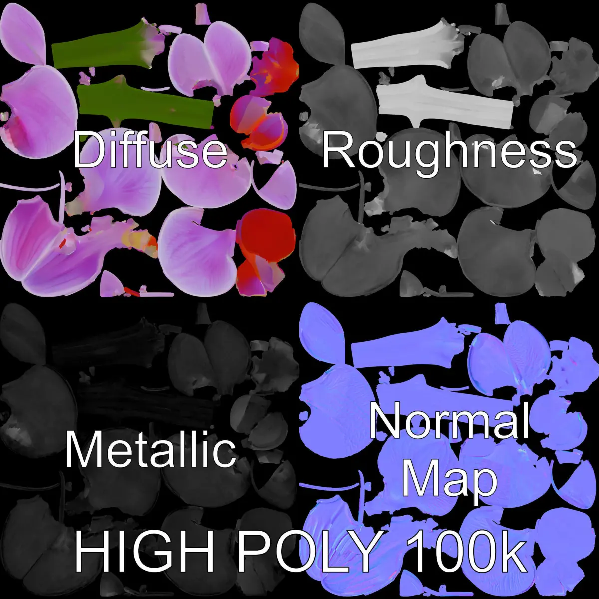 This Orchid Flower 3D model pack is ideal for creating realistic botanical scenes in both gaming and film production. Each model comes with three levels of detail: low-poly for mobile applications, middle-poly for environmental designs, and high-poly for high-quality productions. Compatible with major platforms like 3ds Max, Maya, Cinema 4D, and game engines such as Unity and Unreal. Textures include PBR, Diffuse, NormalMap, and reflection/roughness/metallic for modern rendering needs. All models have accurately unwrapped UVs with no overlaps. All textures are 4096x4096, optimizing detail for high-resolution displays. The first image is the reference used for creating the 3D model. It is important to carefully evaluate the quality of the model by examining the preview images that display the topology and polygonal mesh. These previews (WIRE and WEB 3D Preview) clearly demonstrate how accurately the model matches the original reference and how well the geometry has been executed. Perfect for virtual reality experiences, interior decoration visualization, and detailed landscape design. If you appreciate the model, please like and leave a comment. Thank you!