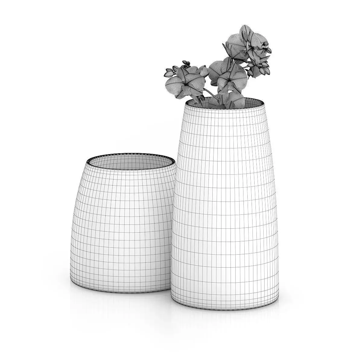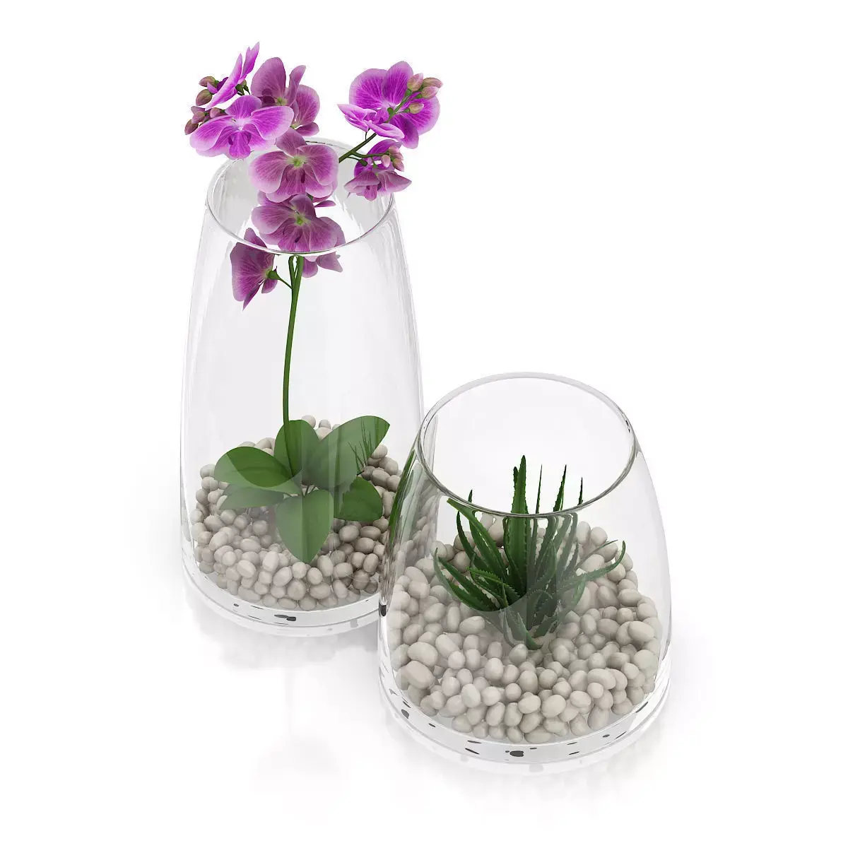 3D model of two plants in glass containers with grey stones on the bottom: pink orchid and dark-green aloe. Compatible with 3ds max 2010 or higher and many others.