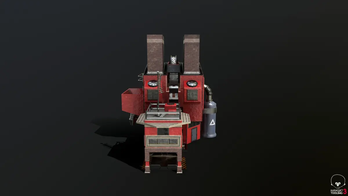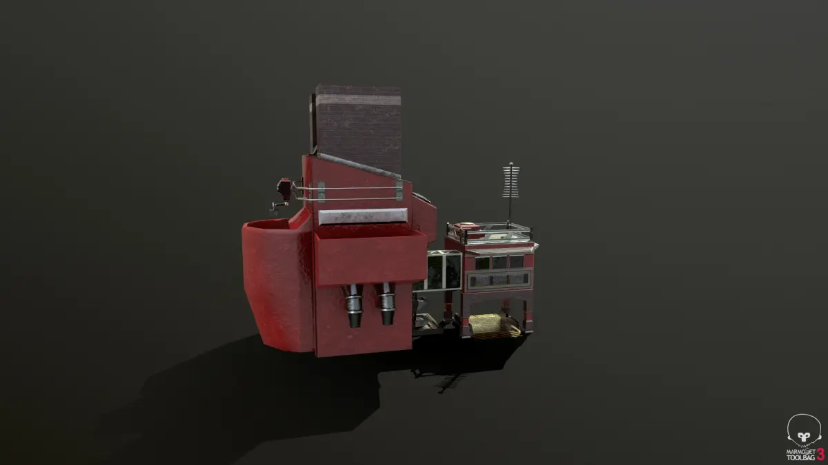 The model of an ore refinery primarlly intended for usage in RTS videogames. It has a long conveyer belt that leads the ore inside the refinery through the roof. Meanwhile you have the administration office outside connected with an air bridge, under which is a scale for the incoming and outgoing trucks through which ore can be dumped into as well.
