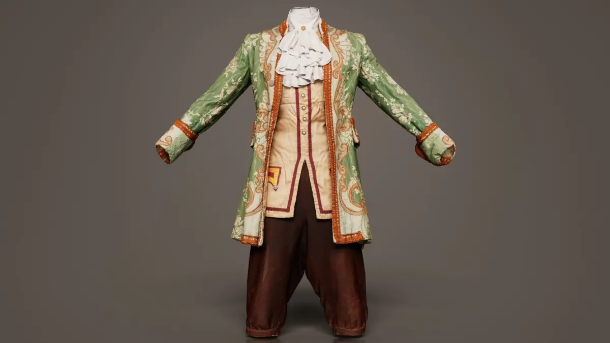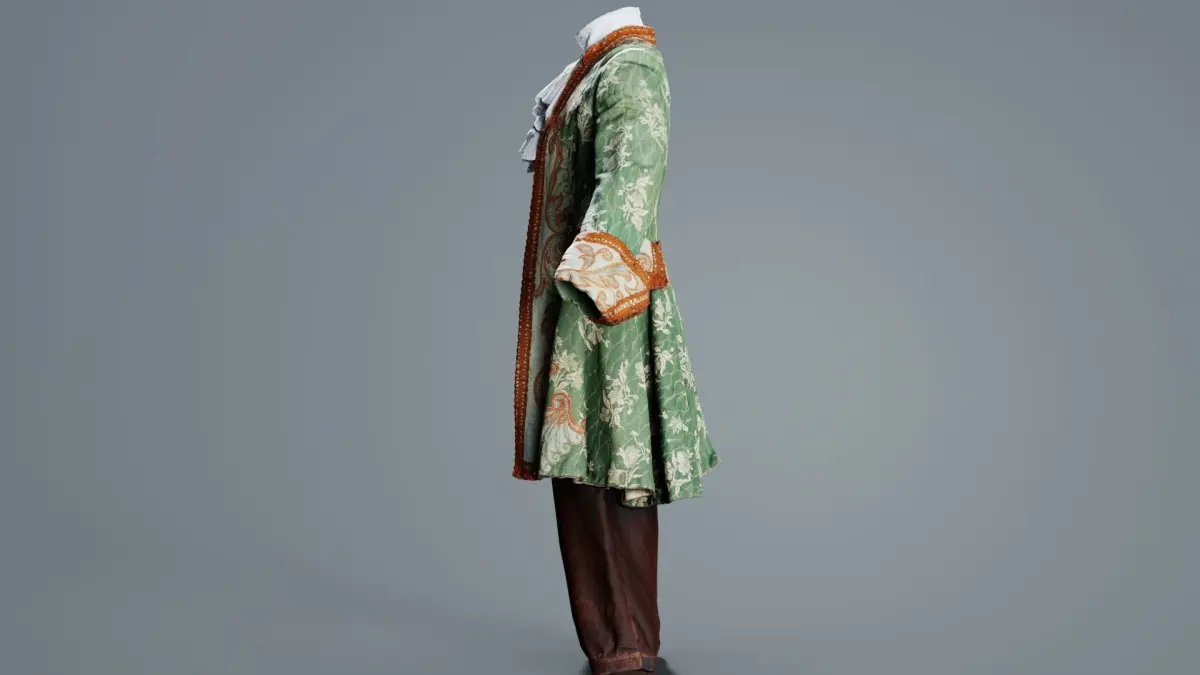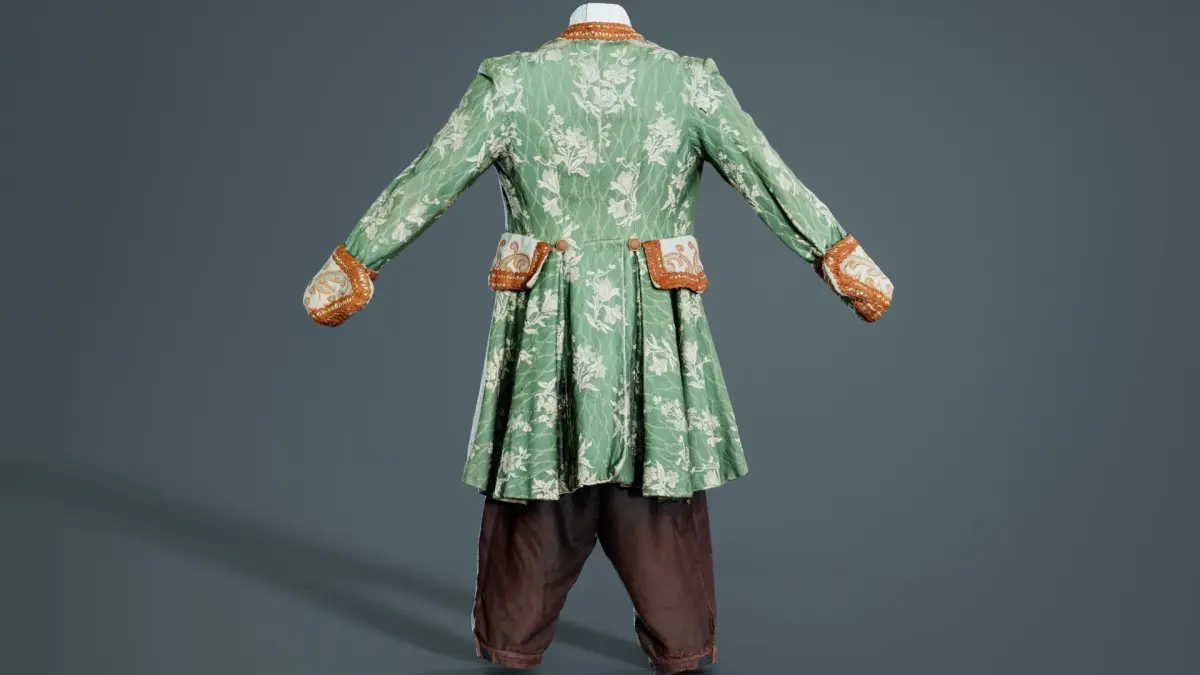 This model, organic decorated historic costume, has been created using photogrammetry from a real world object. It is featuring a green and brown coat with a gold and brown pattern.The 3D Model is part of the Polygonal Miniatures Remastered collection, which has been optimized with better shaders, correct scaling (meters) and centered position.We use multi camera capturing in the 3D scanning process. The scan data is cleaned and processed in Zbrush and Photoshop. In the end, the low poly product contains unwrapped UV's, textures and normals maps. Detailed specifications can be found below: