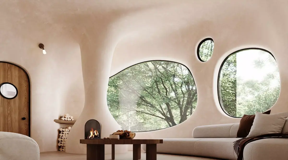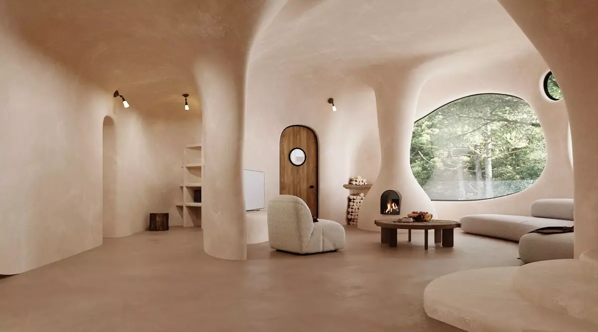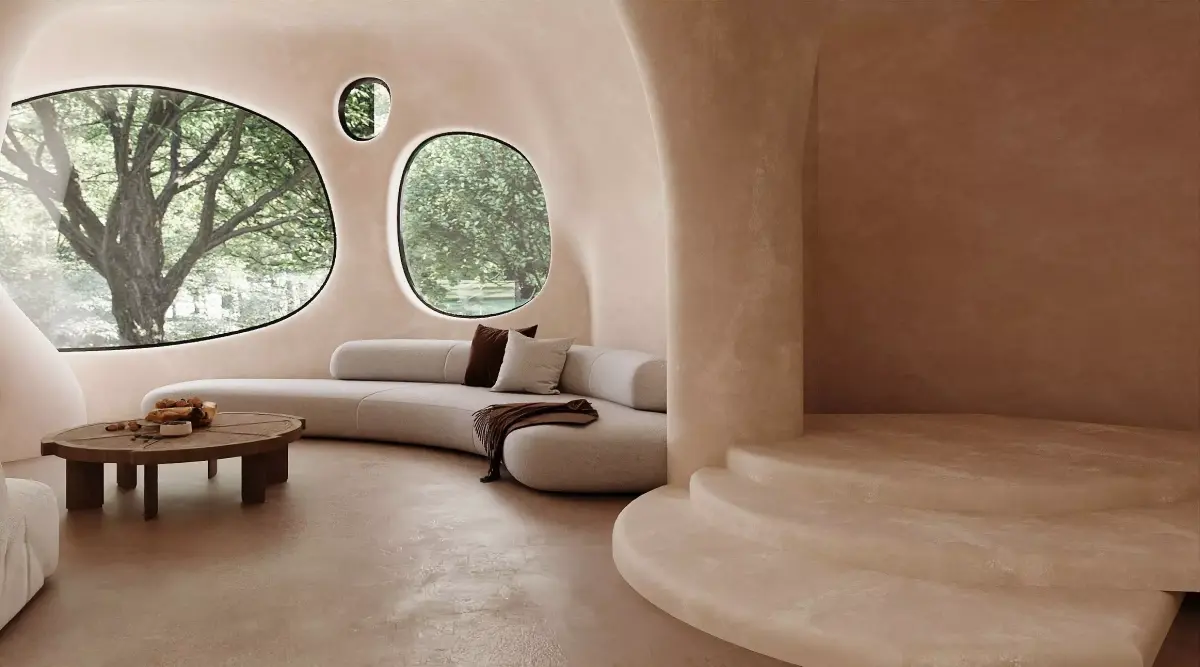 An immersive organic minimal living space shaped as a soft, cave-like shell. Curved plaster walls flow into rounded columns and arches, creating a continuous envelope that feels handcrafted and calm. A low, serpentine sofa lines the perimeter, paired with a cozy boucle lounge chair and a chunky wood coffee table for a grounded centerpiece. The palette stays warm and earthy—creamy stucco, microcement floor and natural timber—so texture becomes the ornament. Biomorphic openings frame lush greenery outside, washing the interior with soft daylight that plays across the mineral surface. A small fireplace niche and stacked logs add warmth and narrative, while built-in shelves and steps provide sculptural storage and seating moments. Compositions are easy: hero wide shots across the sofa curve, diagonal views through the arches, and tactile close-ups of plaster grain, soft upholstery and wood joinery. Clear circulation and realistic proportions make the scene ideal for residential marketing, hospitality mood boards or look-books that need a serene, handcrafted atmosphere with contemporary credibility.