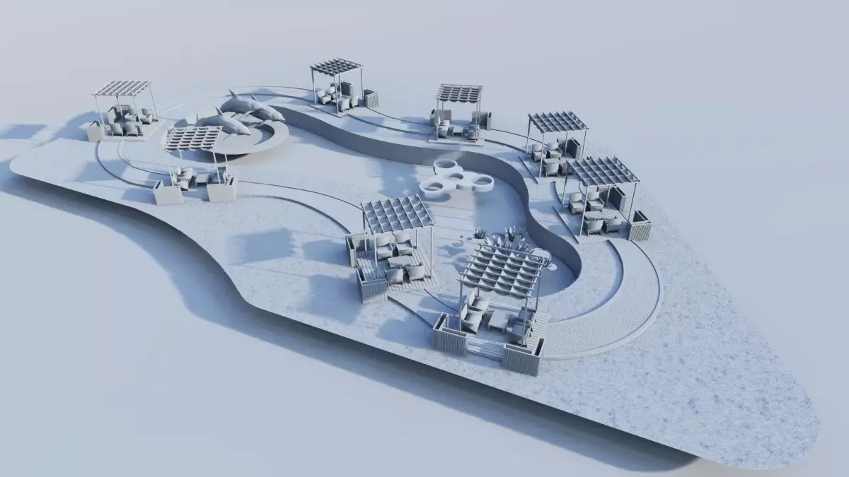 Pergola Seating Areas: Multiple modern pergola structures are strategically placed around the water edge. These are typically minimalist, timber, or metal frames that provide shade and define social seating zones.