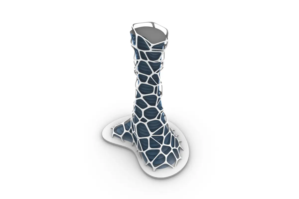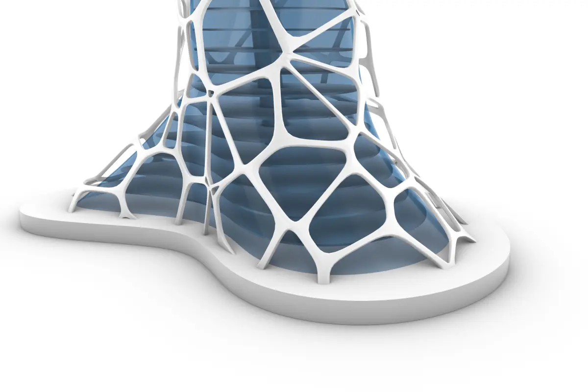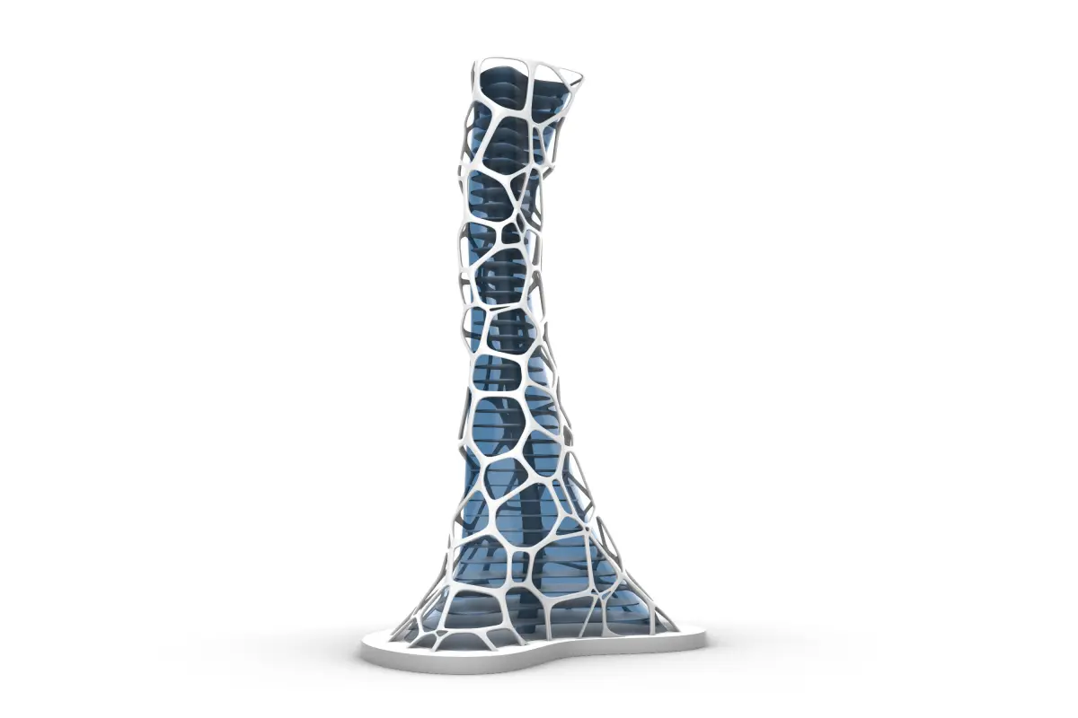 An Organic Science Fiction Skyscraper with an exterior Exoskeleton Organic Cage, wit an Inner Smooth Glass Cover and floor levels with a middle structural Spine holding all the floor.