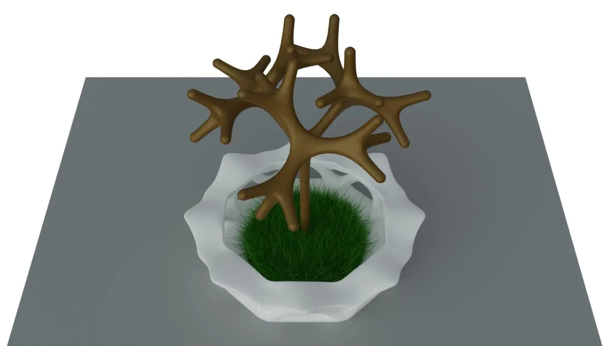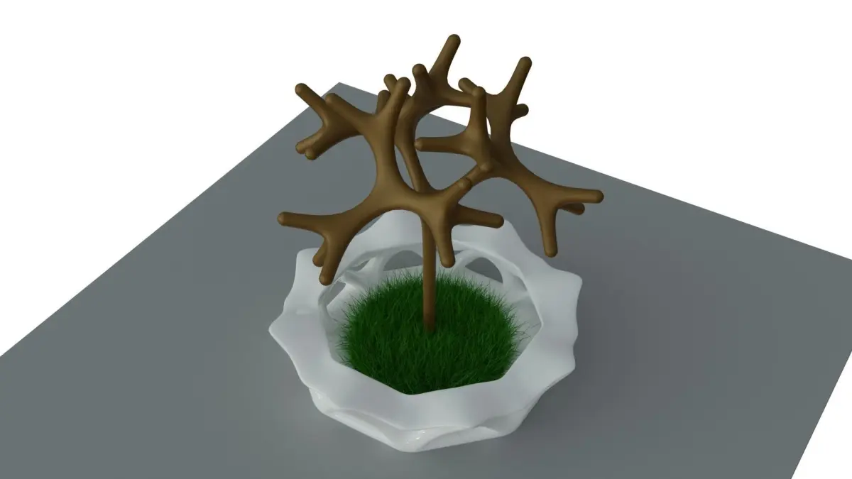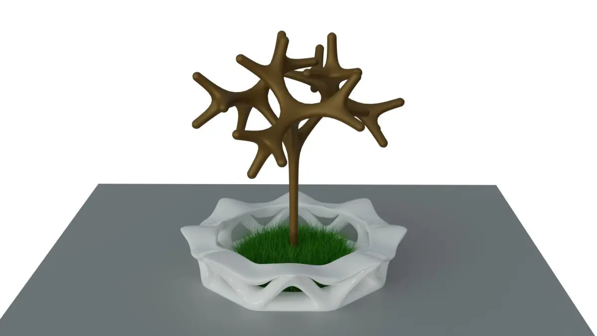 A Landscape Seating Object that surrounds a circular area contains a tree and grass, the circular seat has a unique organic form mesh that has holes and cavities between its bone-like structure, the form structure mimics nature organic forms, the model was created using computational parametric tools to achieve the most accurate geometry with clean details, it could be used for architectural render purposes outdoors, and also for Landscaping, urban landmarks and a usable pedestrians open air structure.