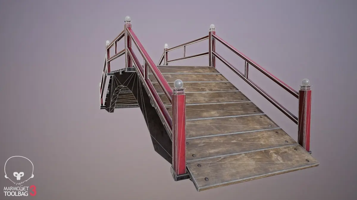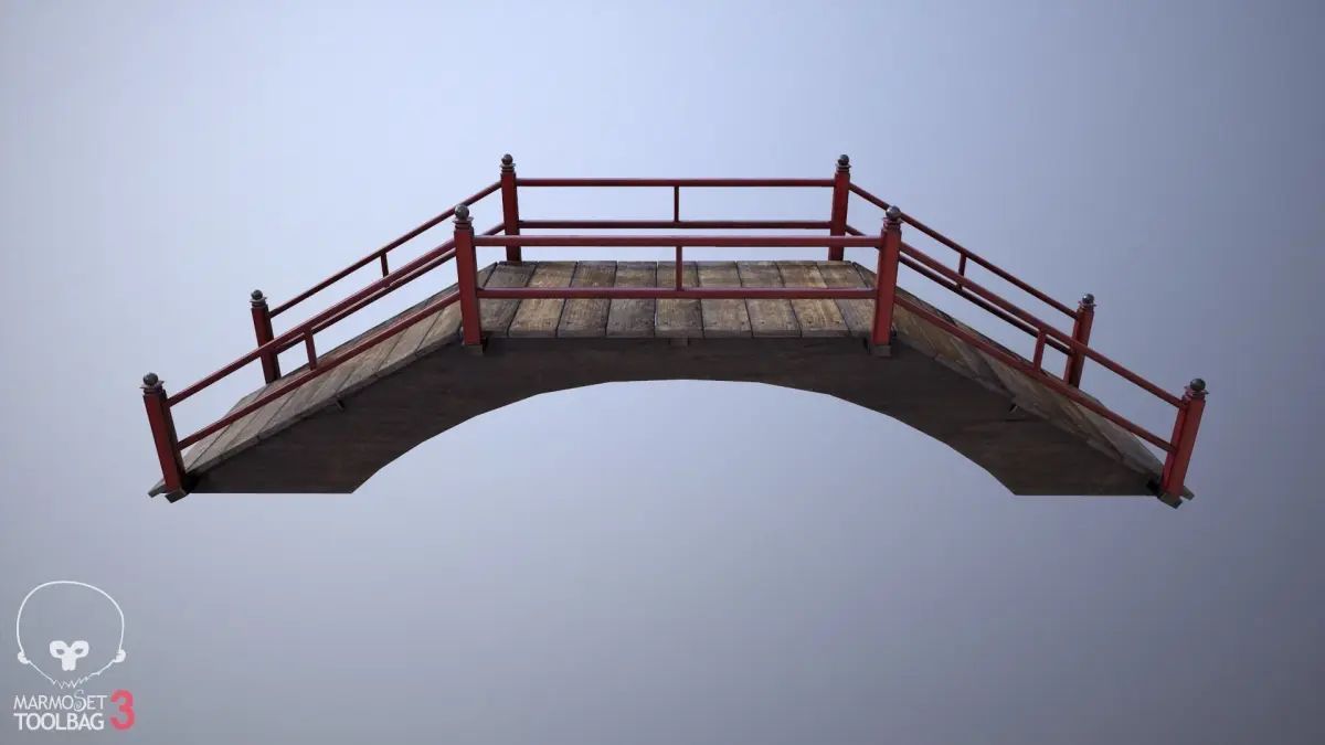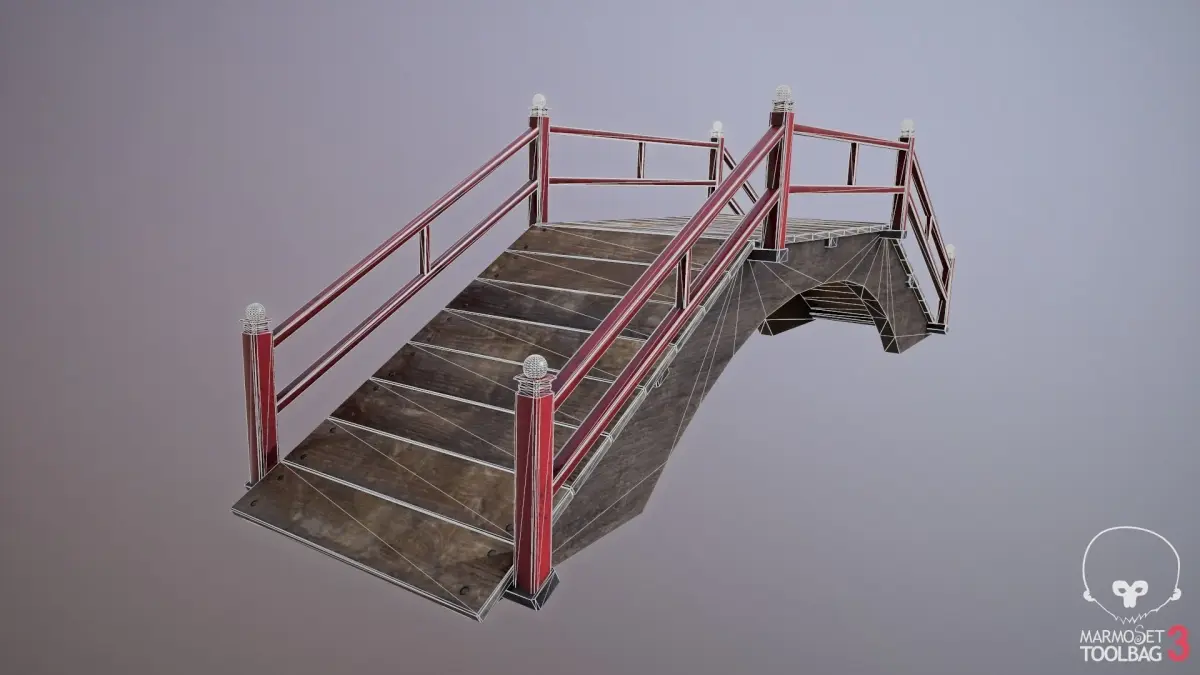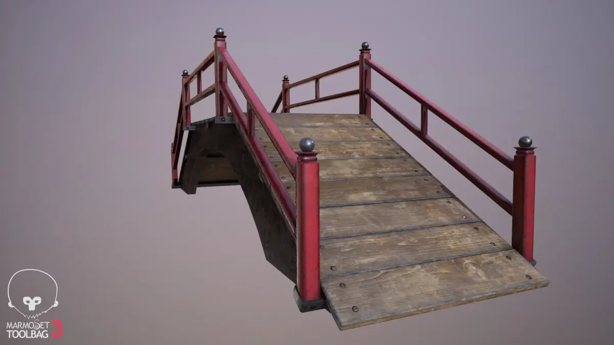 An oriental style bridge, with wooden planks and metal red rails. Planks and metal parts are dirty and aged.Available in different formats. Low poly, gameready.
