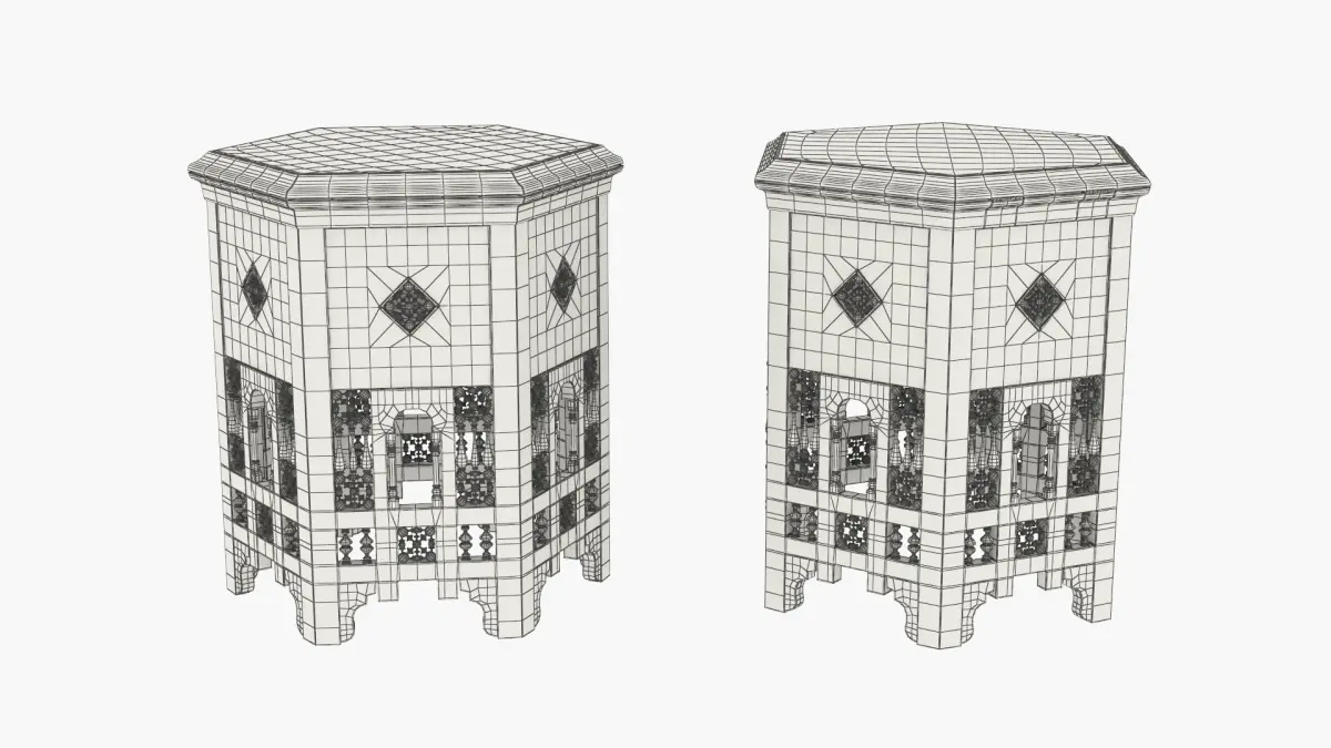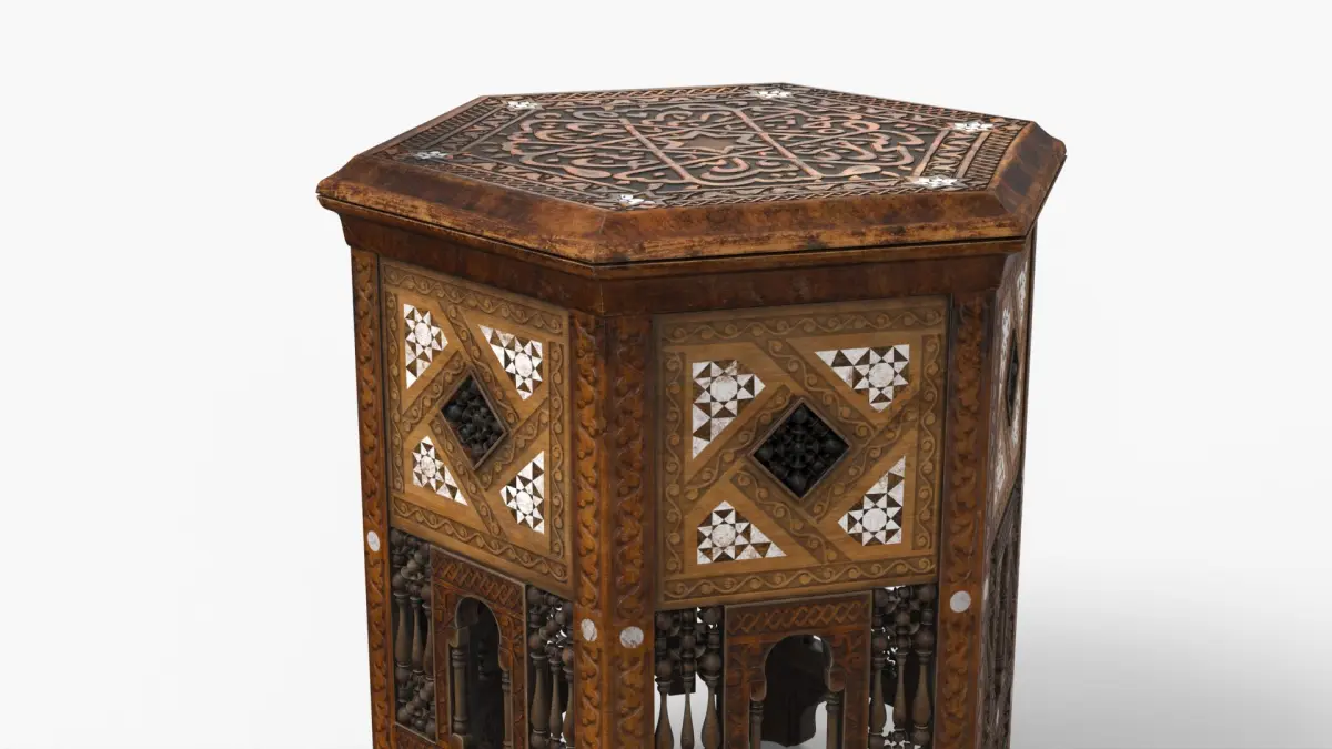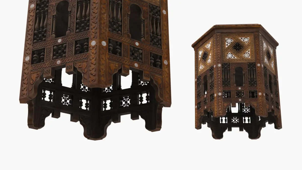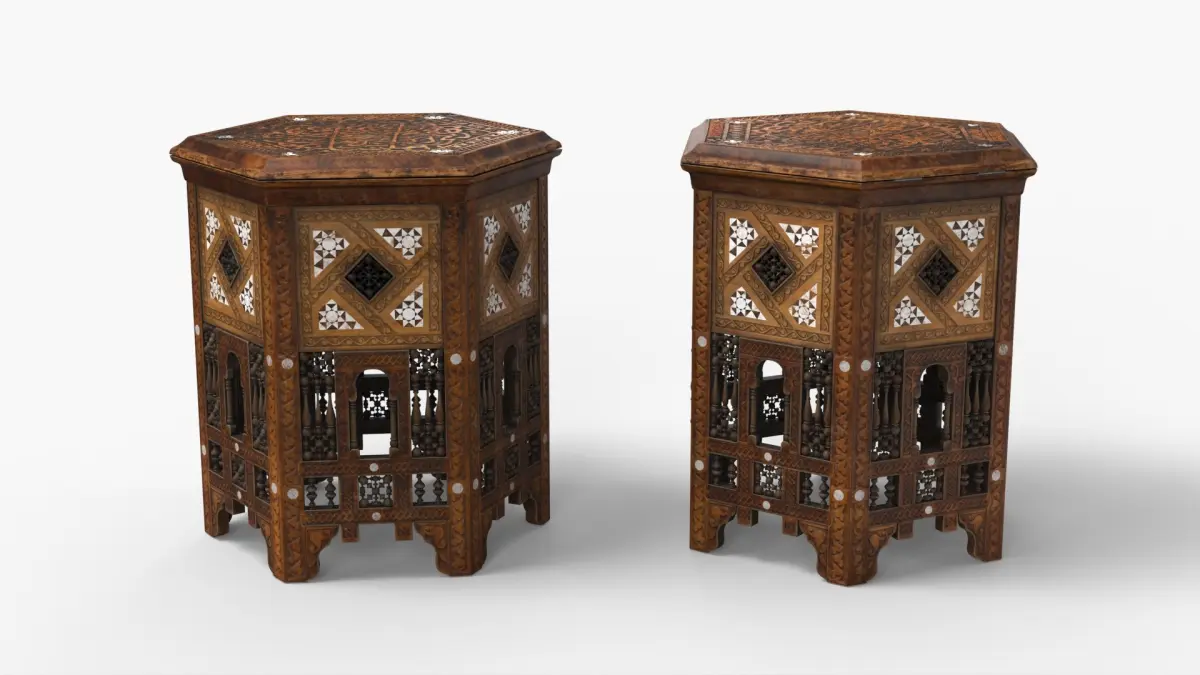 Oriental Wooden Tables Collection is a set of three-dimensional models of intricately designed traditional tables, showcasing unique Middle Eastern craftsmanship.