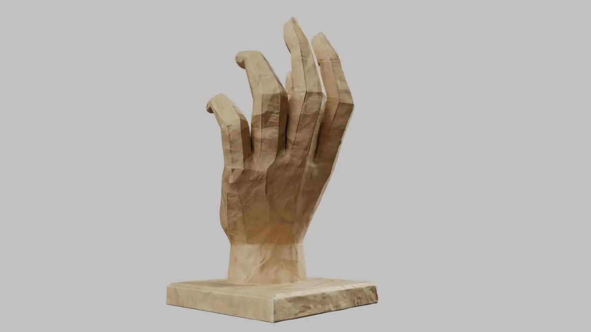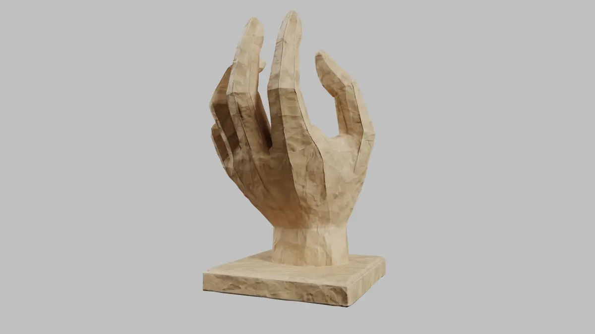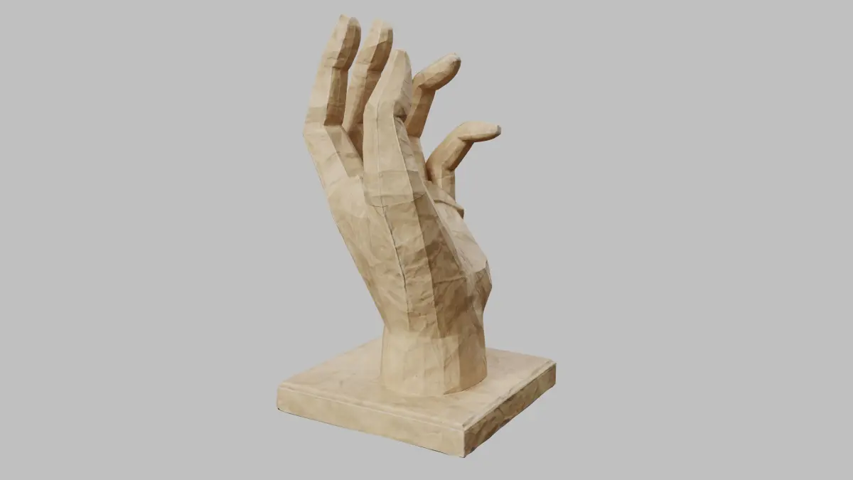 This is a 3D model of a hand sculpture in an origami style. The model features quad topology, is fully UVW mapped, and includes 8K texture maps. It is suitable for interior visualization and decorative purposes. Multiple file formats are provided: .max, .obj, .fbx, .abc, and more.