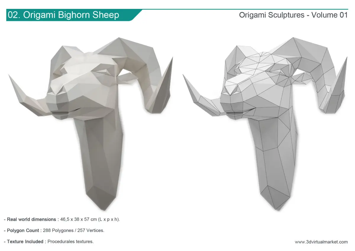 2/. Origami Bighorn Sheep : L.46,5 x H.57 x P.38 cms / 288 polygones and 257 vertices.