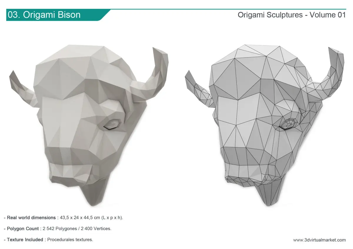 3/. Origami Bison : L.43,5 x H.44,5 x P.24 cms / 2 542 polygones and 2 400 vertices.