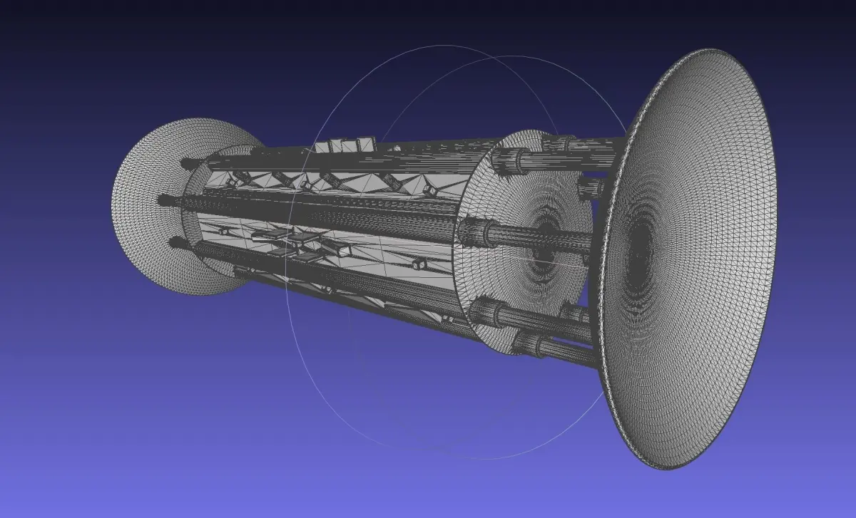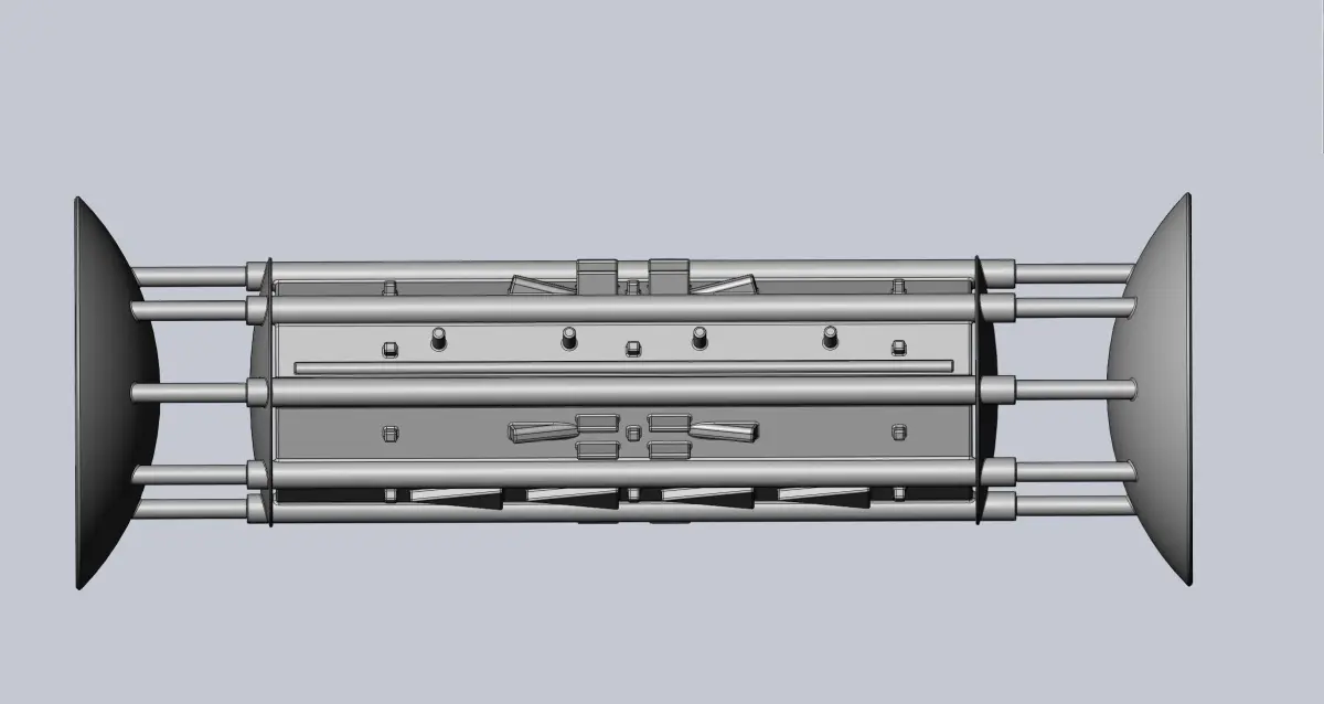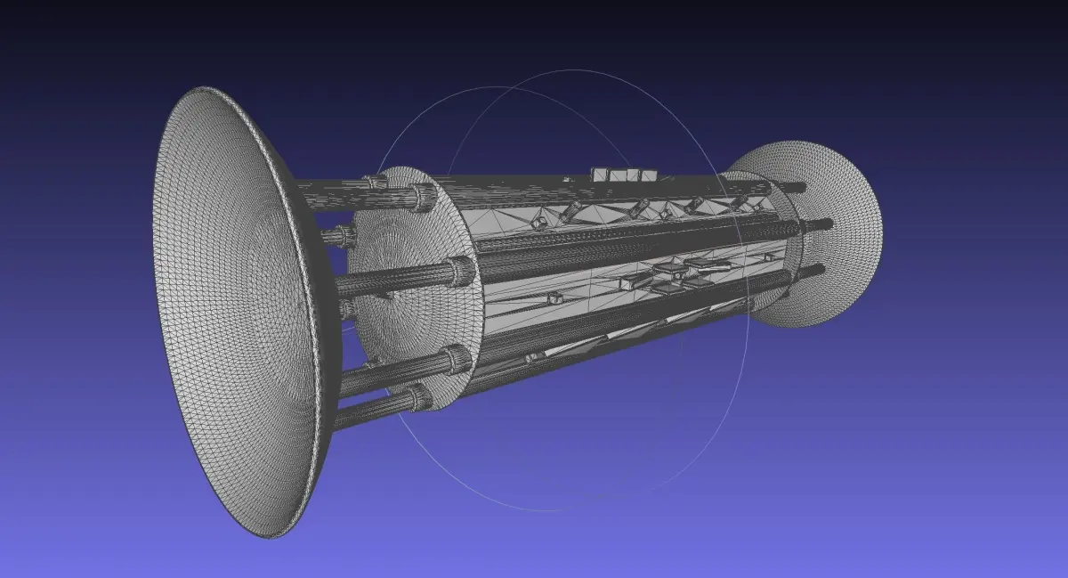 A 1/1000 scale model of a theoretical concept for an interstellar spacecraft based on the orion drive meanign the ship essentially detonates hydrogen bombs behind itself and uses the shockwave as thrust with a large giant armored plate and dampened pistons at the rear to translate the short pulses into a more continuous accelerationthis versin is designed as an interstellar vessel using two armor plates one to speed up and one to slow down so it doesn't need to turn around at the halfway point - this is useful since at a significant fraction fo the speed of light you need frontal armor to protect yourself from the interstellar medium anywaysthe model is designed at 1/1000 scale and is 1 meter long but can be scaled down further