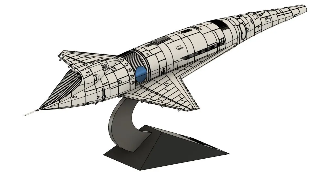 Modeled from scratch by Buissonland, after pictures from different model of the spaceship.I tried to be as close as possible from the real screen used model and keep it doable with any printer.Size printed @ 100% : 447mm x 221mm x 46mm (without Stand)This equivalent to a 1:145 scale model.