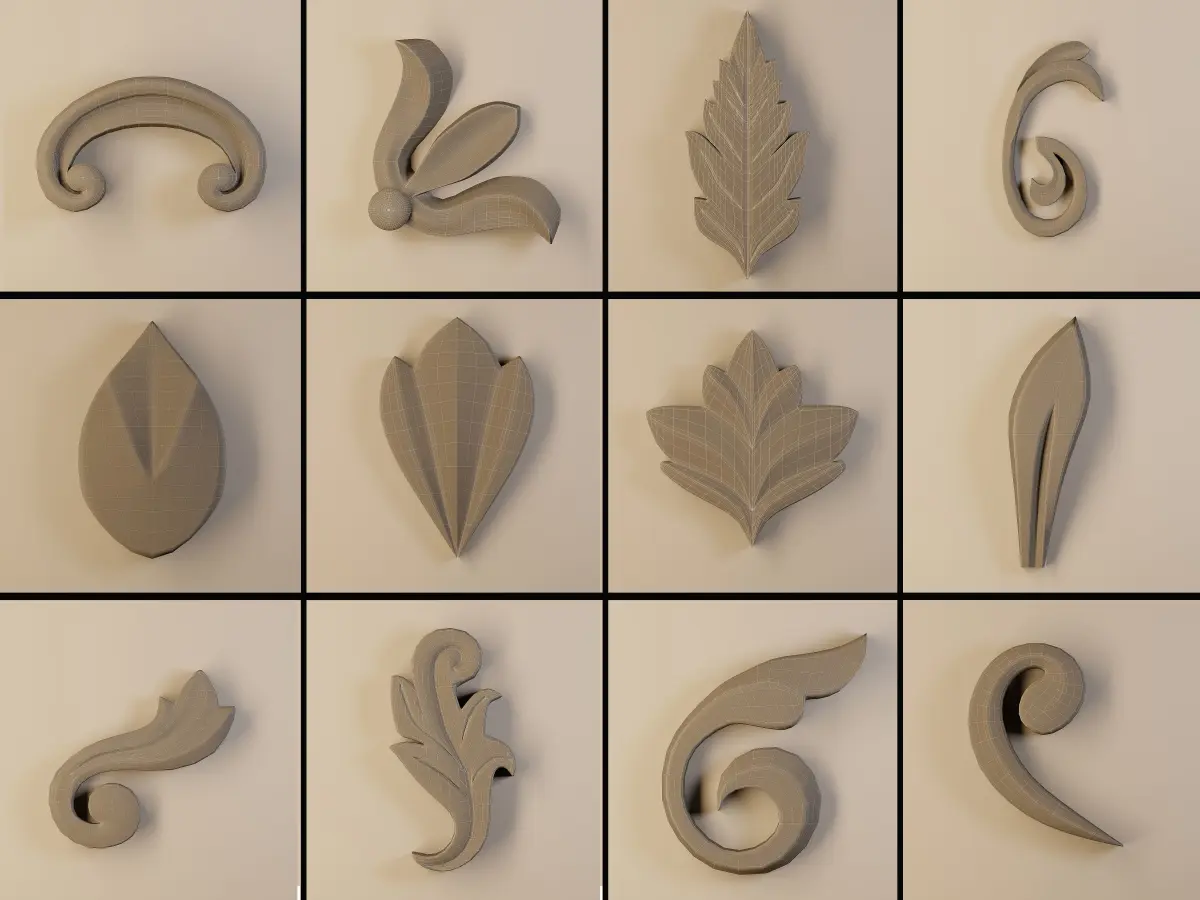 This product includes 12 ornamental kitbashes for architectura, woodcarving or any other modeling subjects.