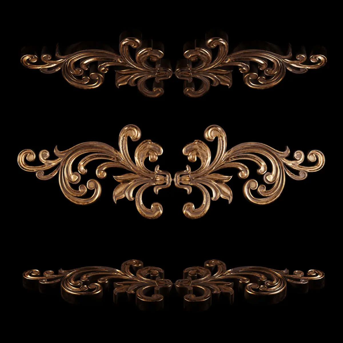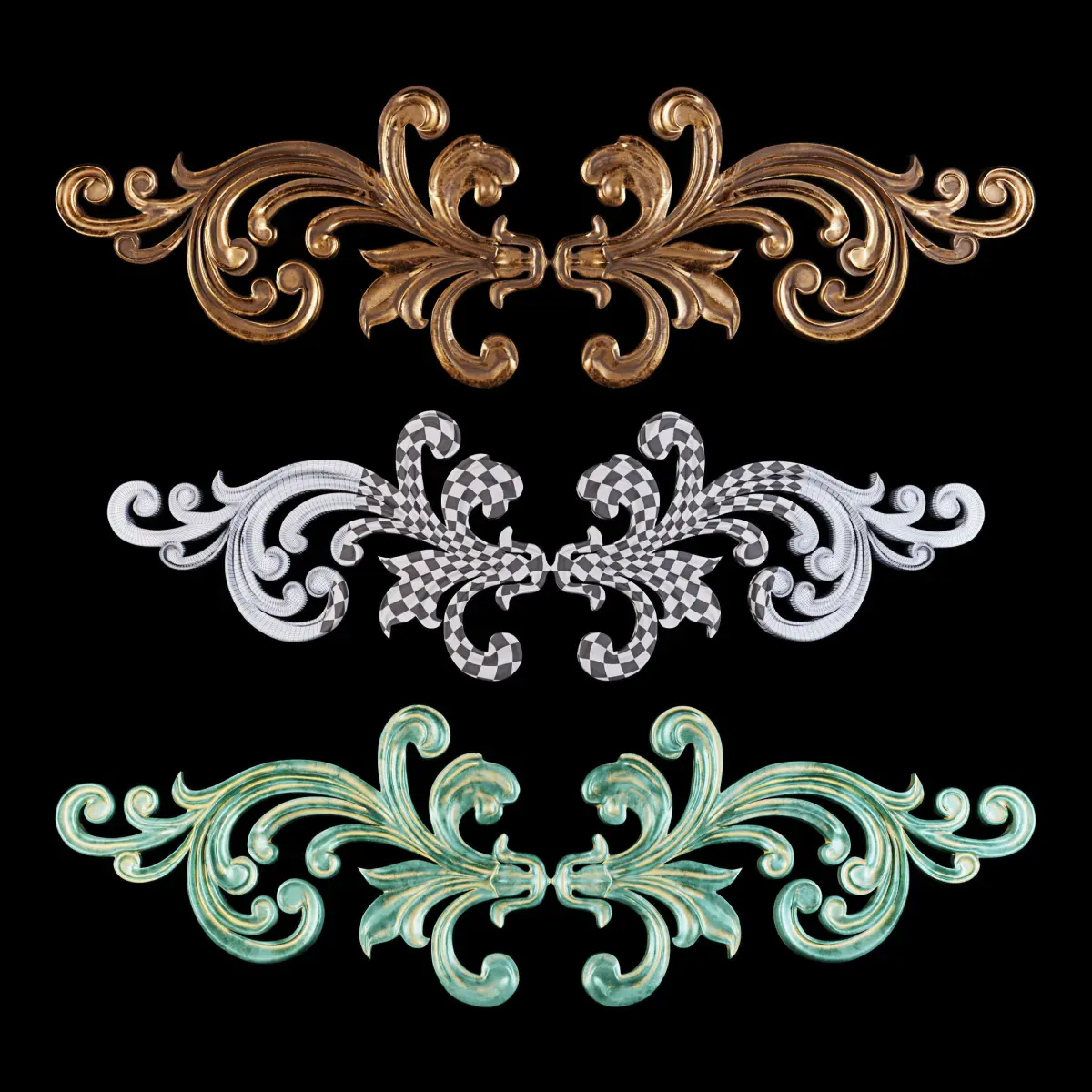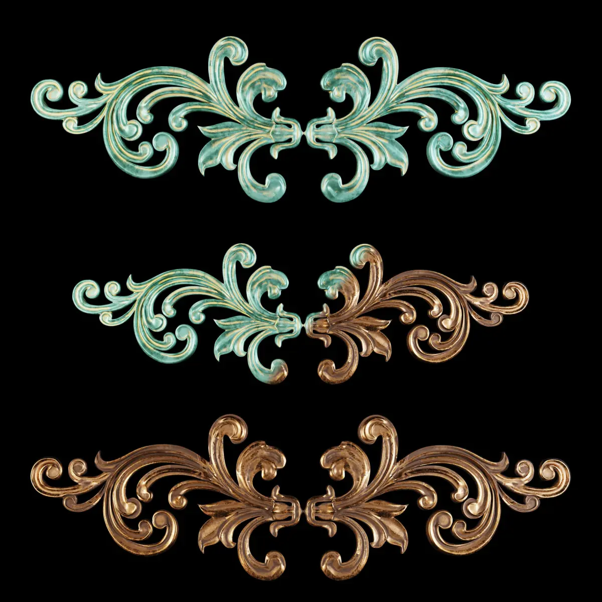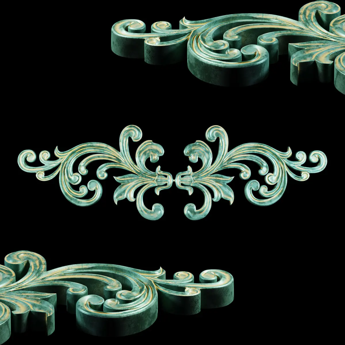 This is the old decoration oranament that can use in diffrent objects like decorative plaster,Frame,mirror frame and furniture..It is in 2 compeletly diffrents material one is old dirty copper and another one is old Oxide metal or can be kind of ceramic in present..it is usable for every classical place,frame and decoration in interior design or game designe..I set it up in 3 diffrent format (obj,Fbx,Max)my first idea is from old Asian ornaments...and 3 diffrent lighting and materialing renderer engine (Vray,Corona)I hope you like it..