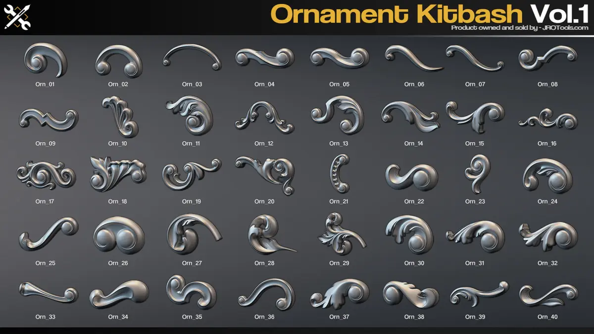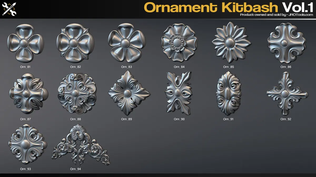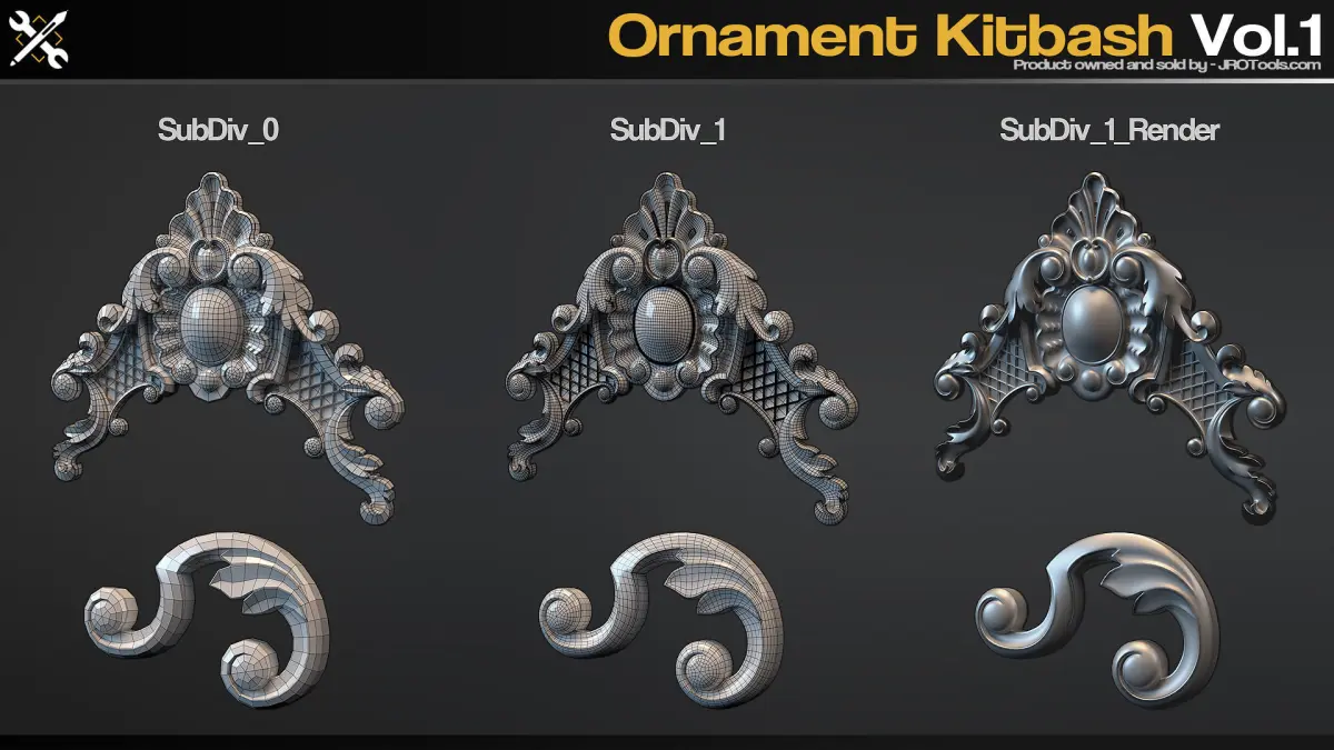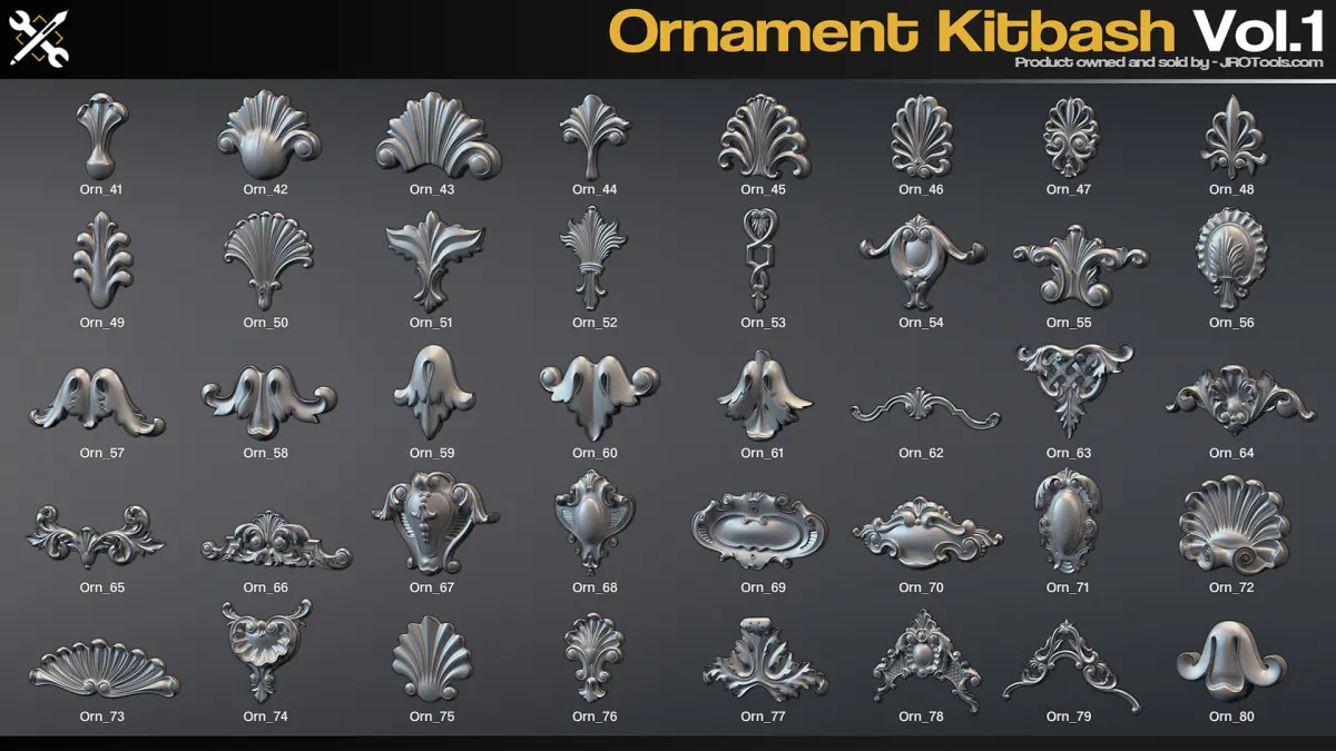 This is a set of 94 Ornament Kitbash pieces which is also included as an IMM brush for ZBrush. the ornament meshes are modeled to easily be subdivided and work/look well at different subdivision levels and poly counts, all pieces has also been UV unwrapped so you can easily create textures or use tiles over the meshes.