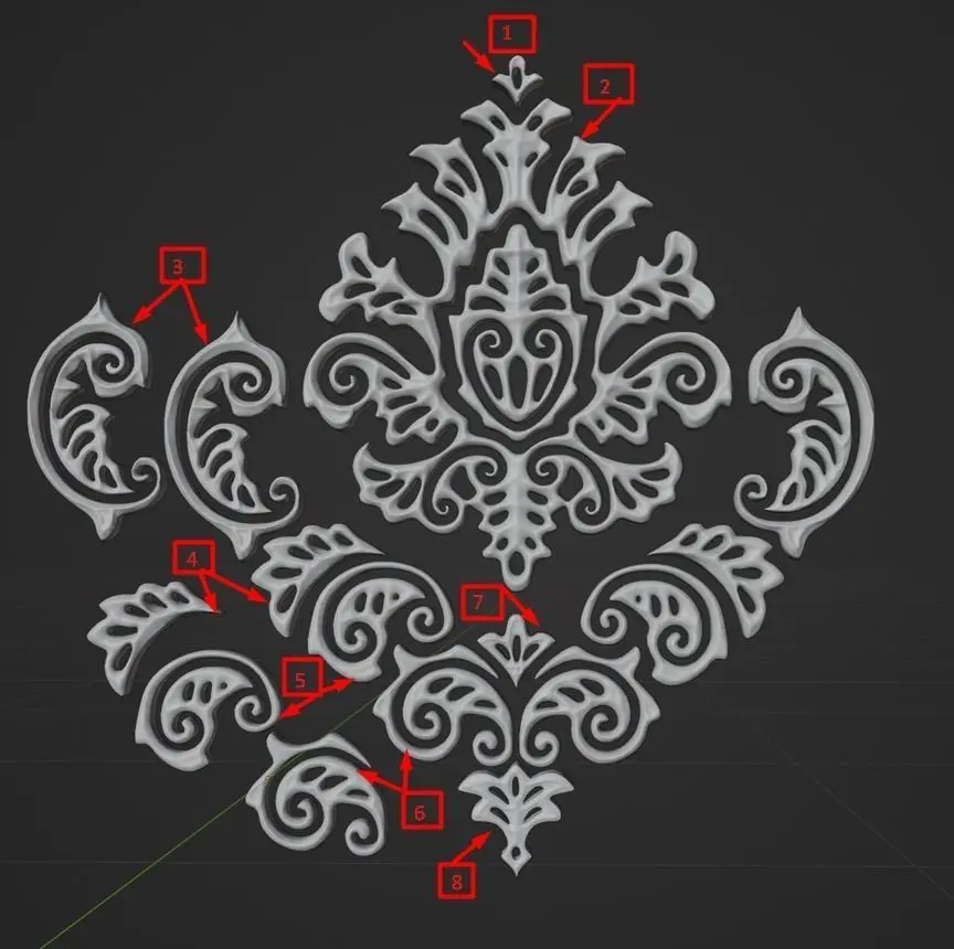 There are 8 different decorations. 4 of them are divided into 2 groups: with mirror modification and without. All of them are in baroque style, can be used separately or together. Can be used for commercial purposes. Please do not resell them in any kind of model that will be sold as a stock model. Thanks.