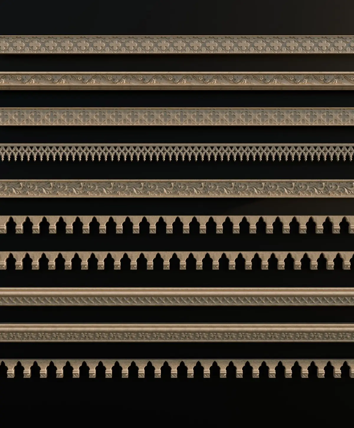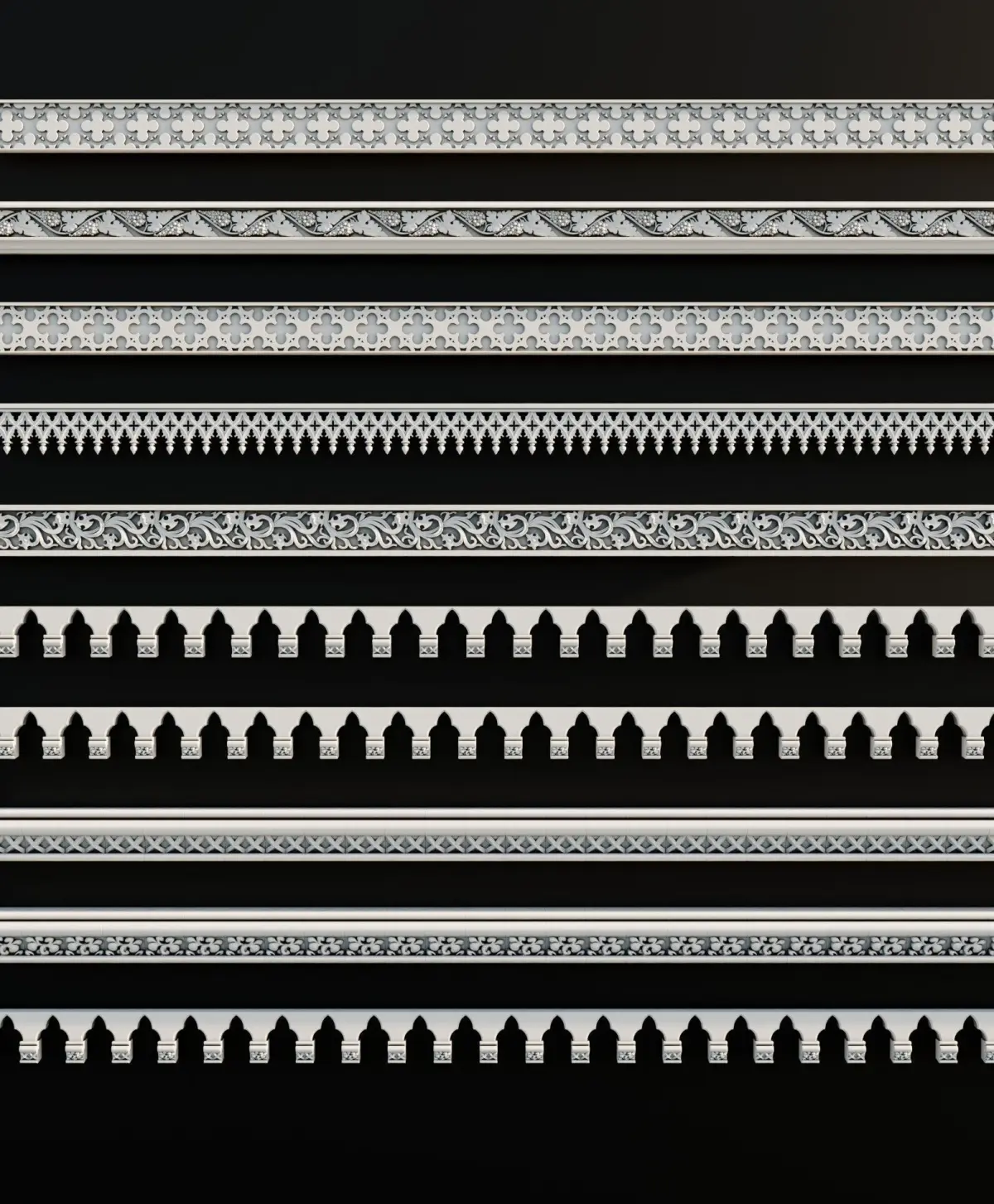 Ornament Pack Vol 10The ornament pack contains 10 decorative ornaments, each with a properly created UV map and designed to be tilable. This allows you to use them with the Array modifier in Blender or similar options in other 3D software:
