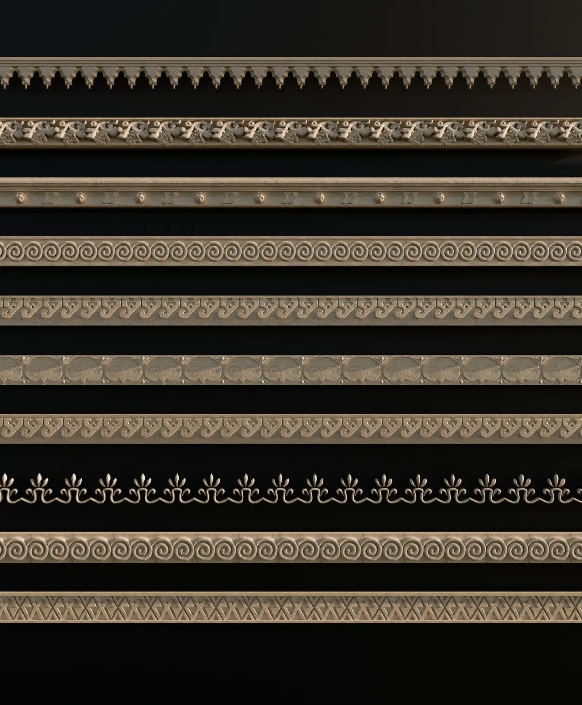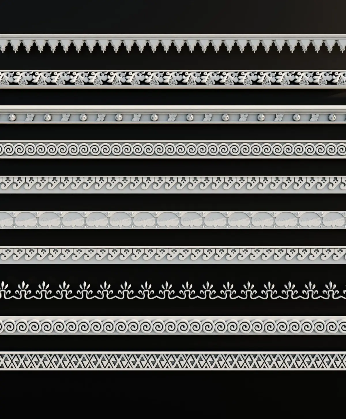 Ornament Pack Vol 12The ornament pack contains 10 decorative ornaments, each with a properly created UV map and designed to be tilable. This allows you to use them with the Array modifier in Blender or similar options in other 3D software: