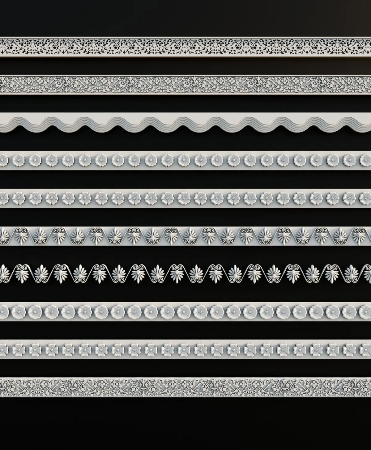 Ornament Pack Vol 18The ornament pack contains 10 decorative ornaments, each with a properly created UV map and designed to be tilable. This allows you to use them with the Array modifier in Blender or similar options in other 3D software: