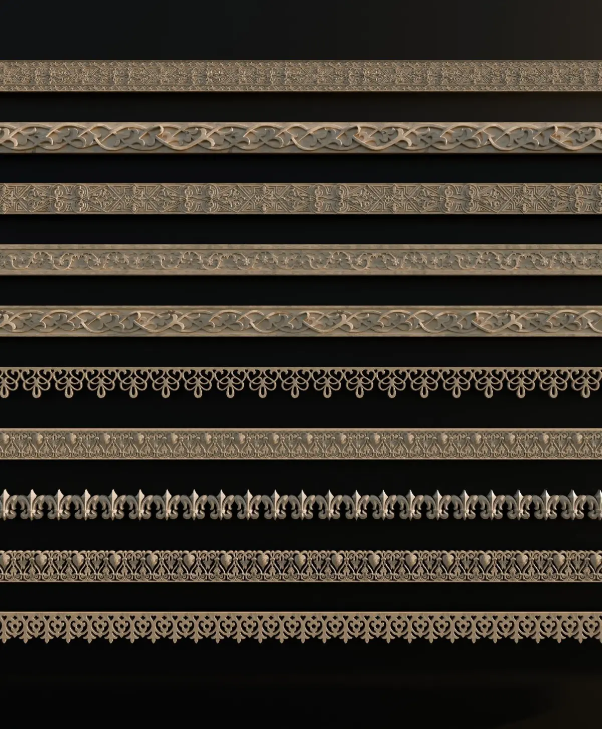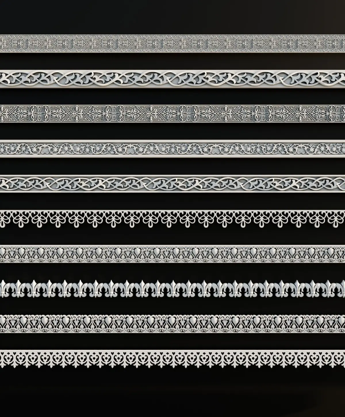 Ornament Pack Vol 25The ornament pack contains 10 decorative ornaments, each with a properly created UV map and designed to be tilable. This allows you to use them with the Array modifier in Blender or similar options in other 3D software: