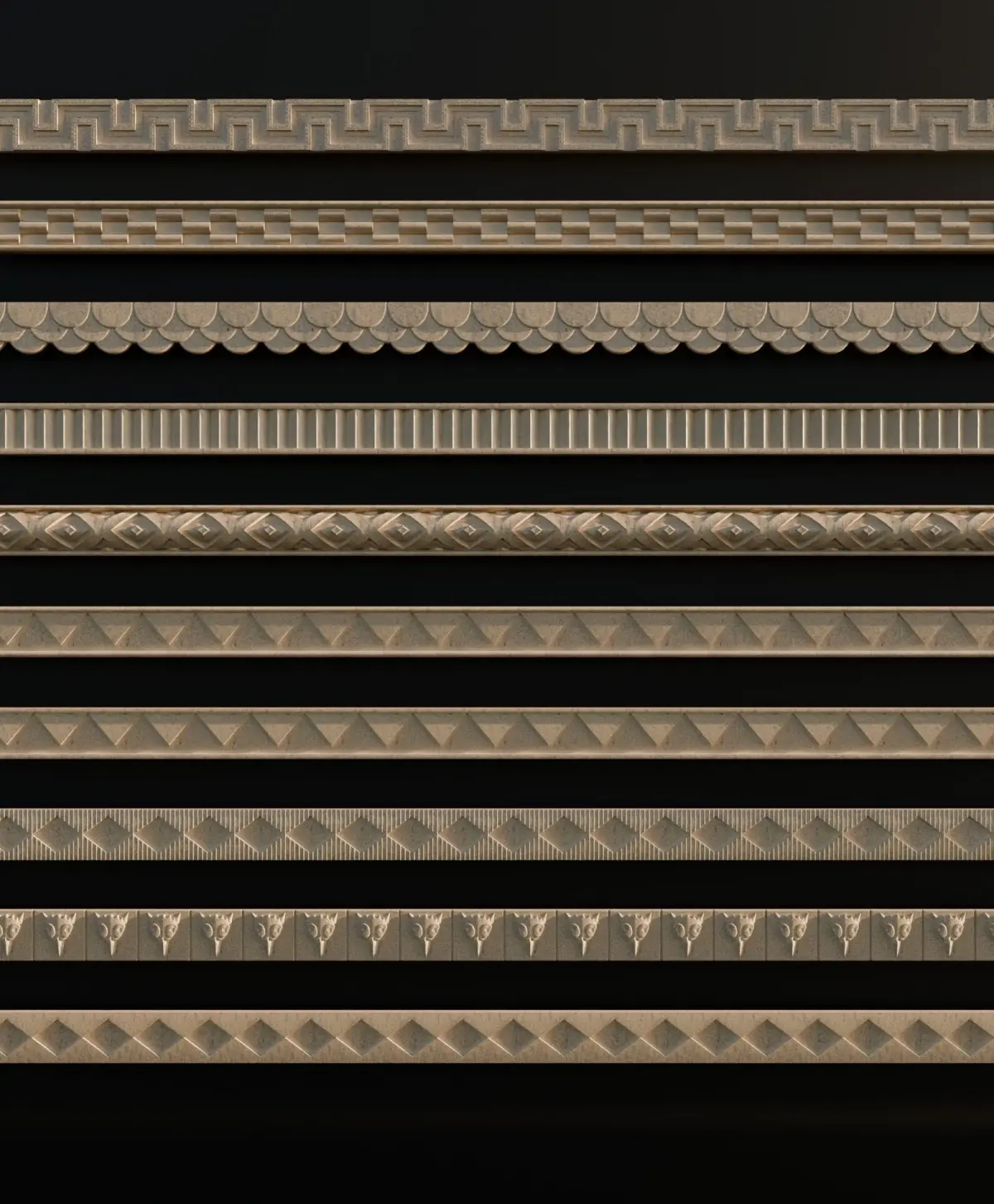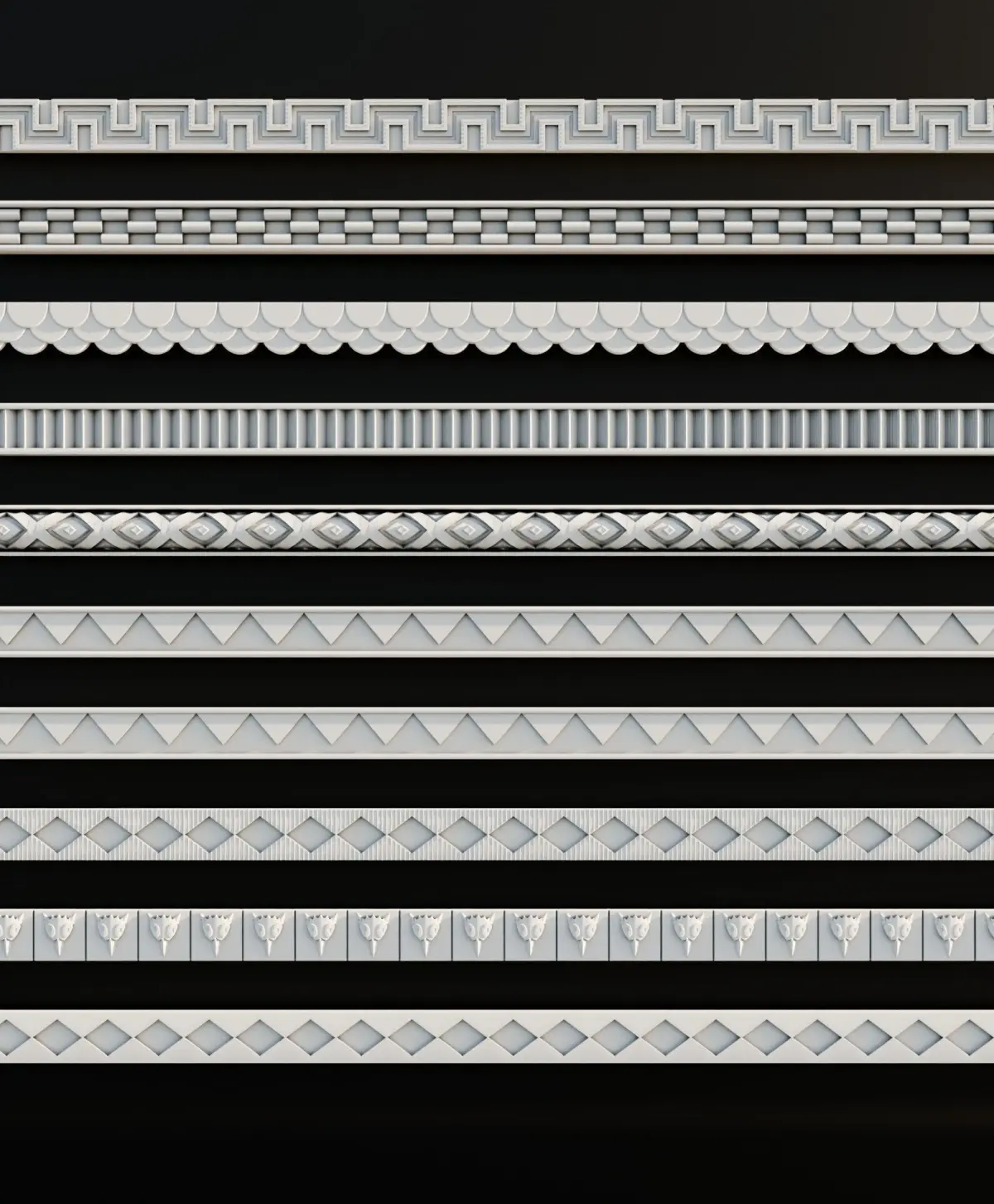 Ornament Pack Vol 7The ornament pack contains 10 decorative ornaments, each with a properly created UV map and designed to be tilable. This allows you to use them with the Array modifier in Blender or similar options in other 3D software: