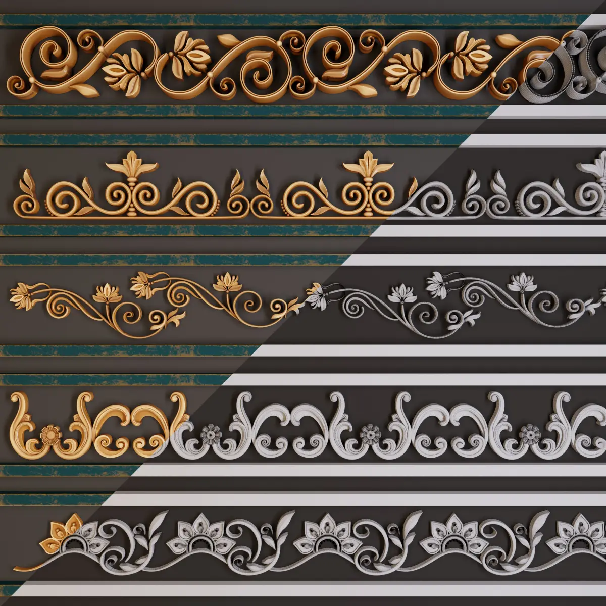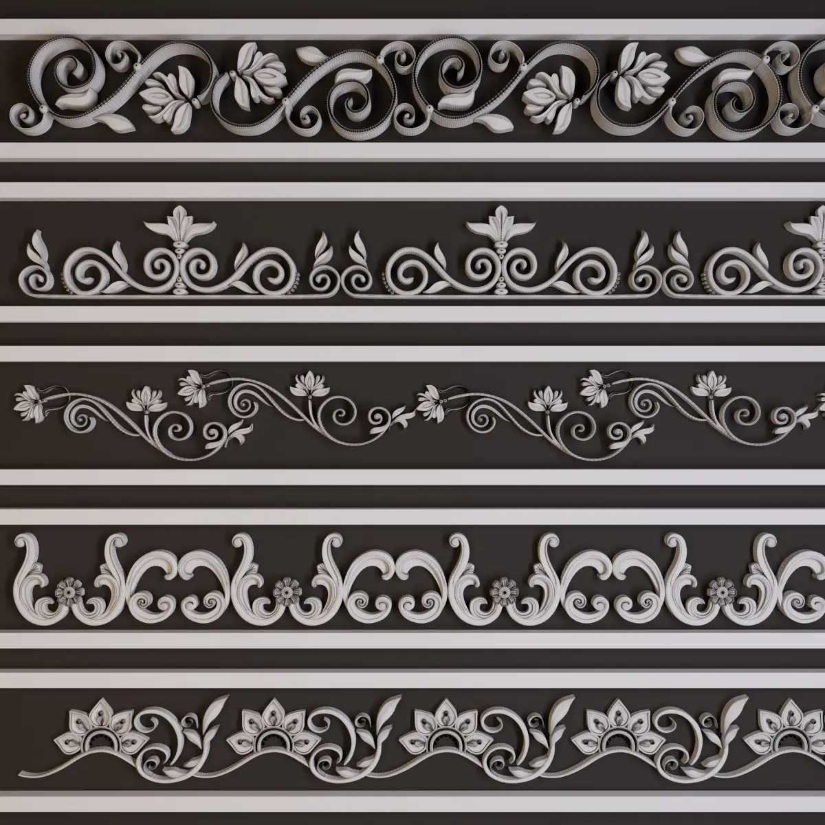 This product includes 5 TrimOrnament for using any 3D software (3dmax, maya, blender, C4D, ...). There are also 5 previews for the product. 3DMax files saved 3dmax 2014 version. The fbx file is also available. There are also models in Png and Mtl and BMP format.
