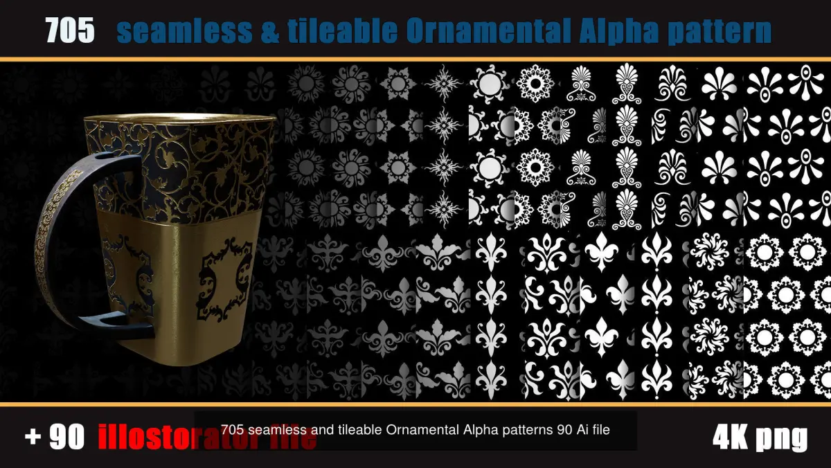 Here is collection of Ornamental seamless Alpha patterns collection These Alphas are usable in substance painter and zbrush and any other painting and sculpting softwares.