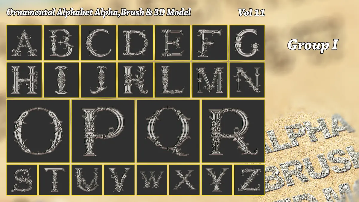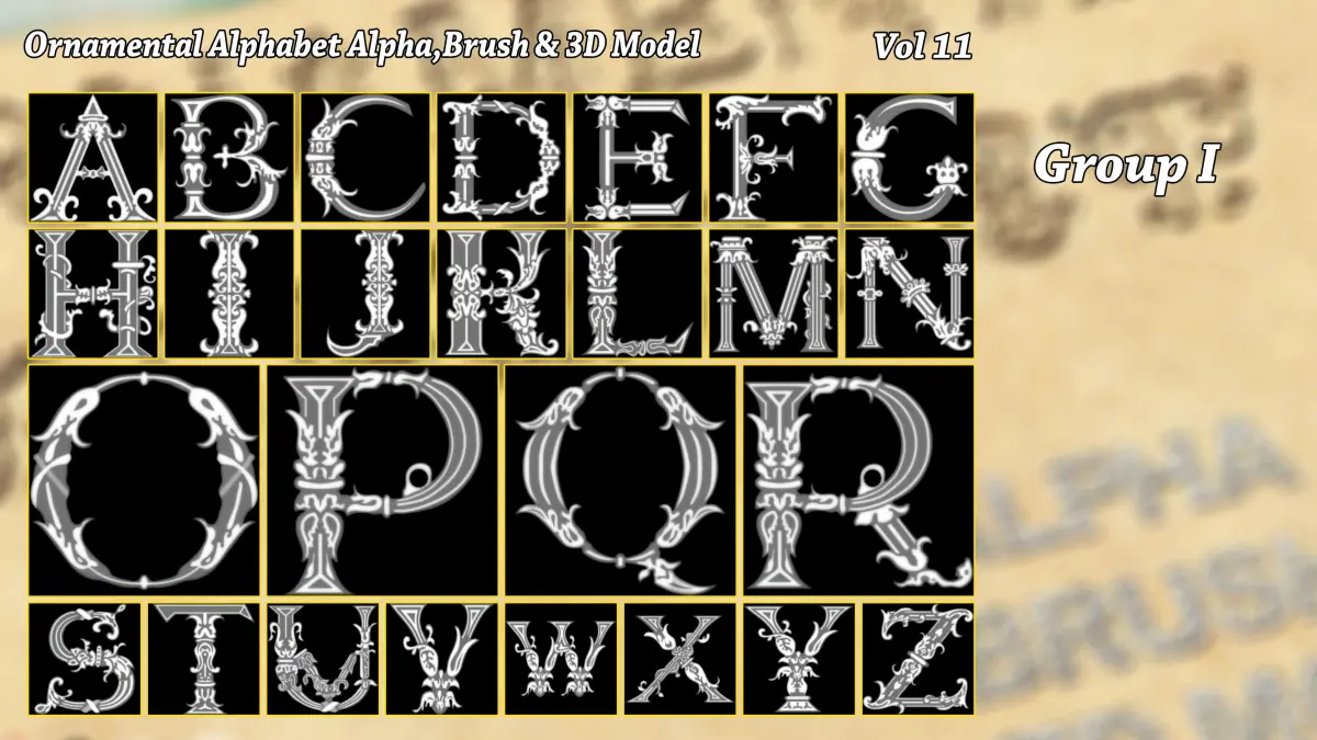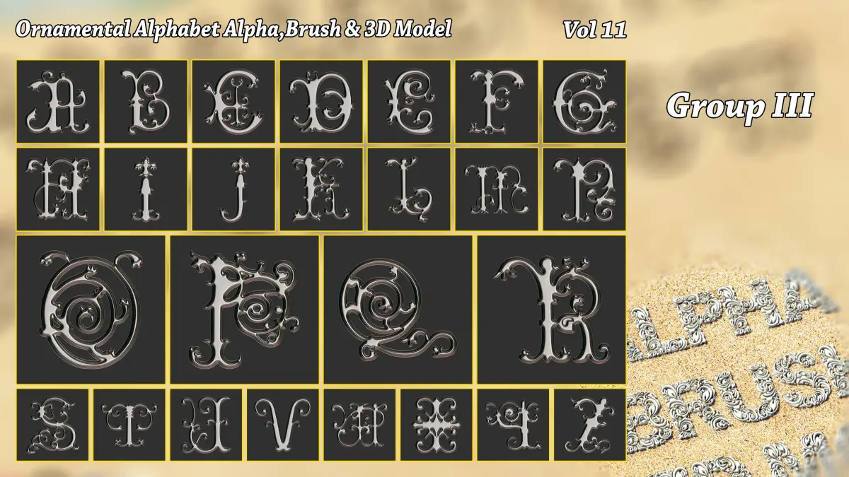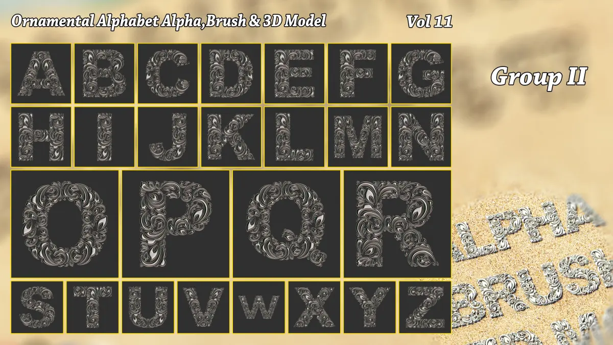 **- Ornamental Alphabet Brush + Alpha + 3D model vol 11 .