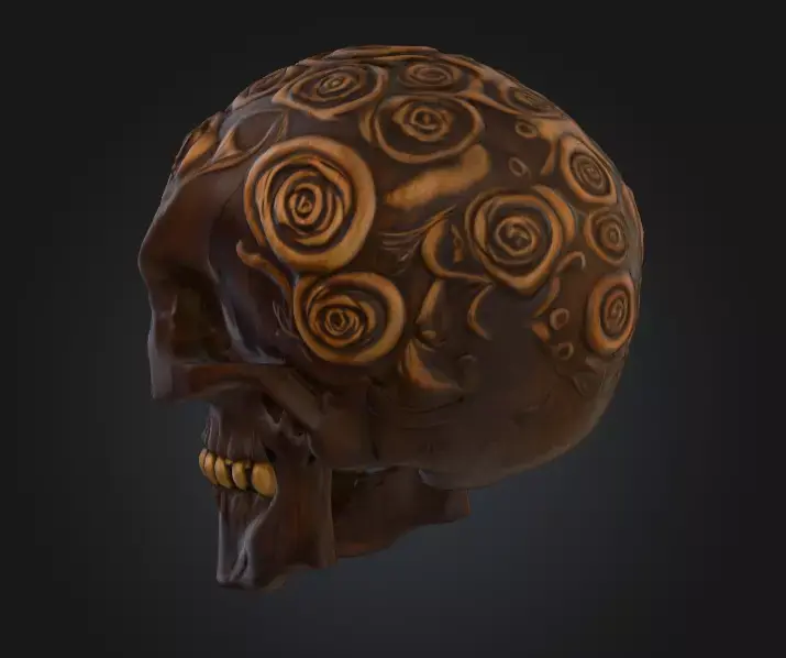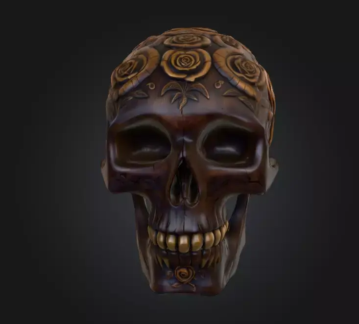 Crafted with a deep mahogany-brown tone, the skull appears almost wooden in nature, its surface polished smooth yet etched with careful, deliberate carvings. Each rose is sculpted with layered petals, their intricate depth contrasting sharply with the hollow voids of the skull’s eye sockets and nasal cavity. The stylized texture work enhances its visual storytelling—subtle highlights, worn edges, and hand-painted detailing lend the model an antique, ceremonial aesthetic.