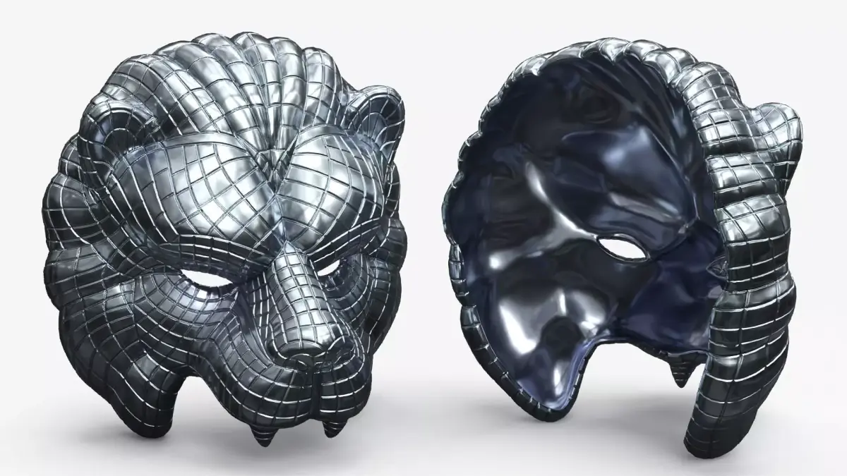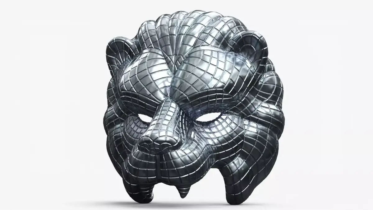 Ornamental Lion Mask Silver is a 3d model of a metallic lion mask featuring a striking geometric design with a sleek, chrome finish.