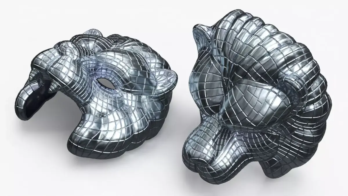This model captures intricate details with a grid-like pattern that adds depth and complexity. The bold, reflective surface resembles polished metal, making it an impressive piece suitable for various artistic and design needs. Its stylized and modern appearance makes it a standout decorative item.