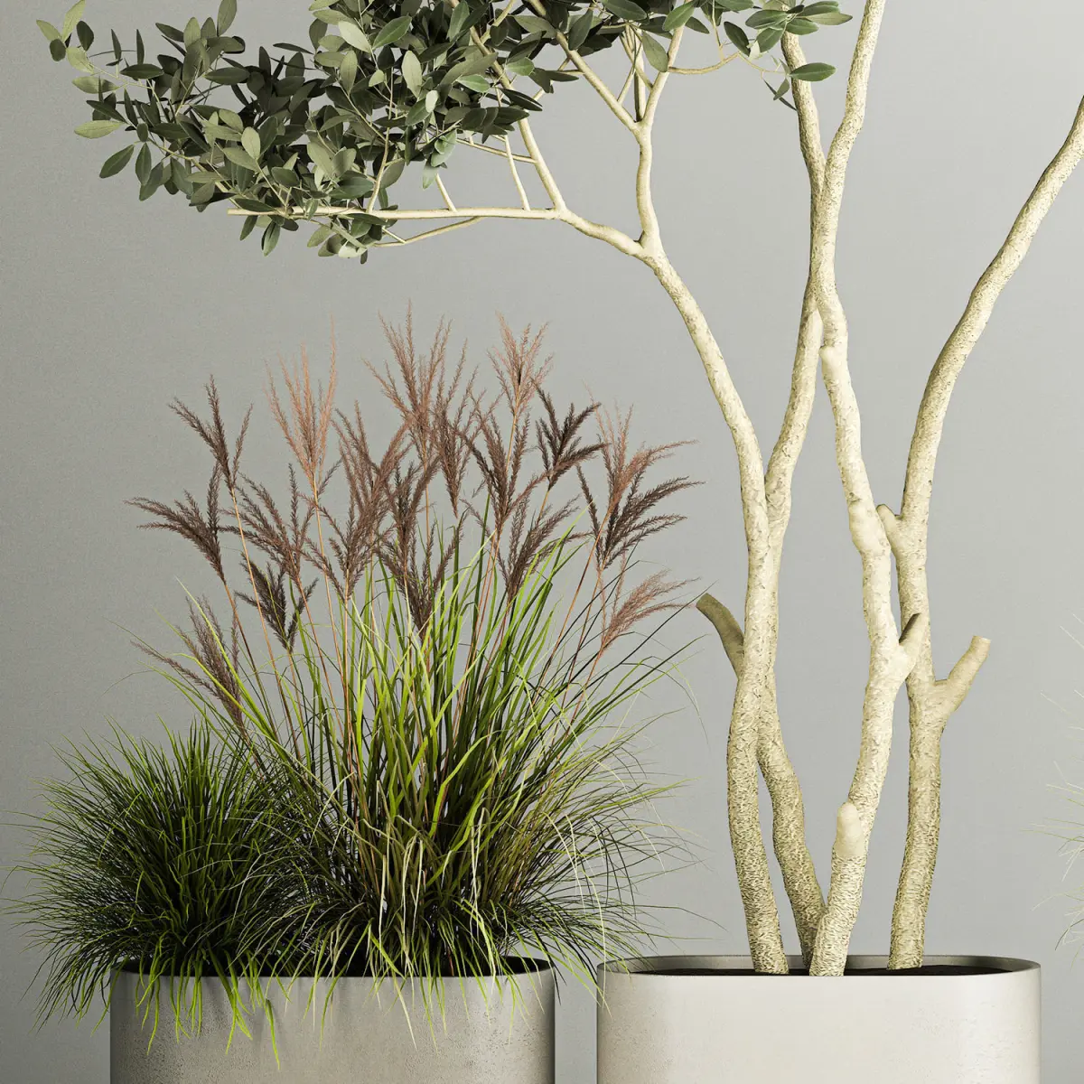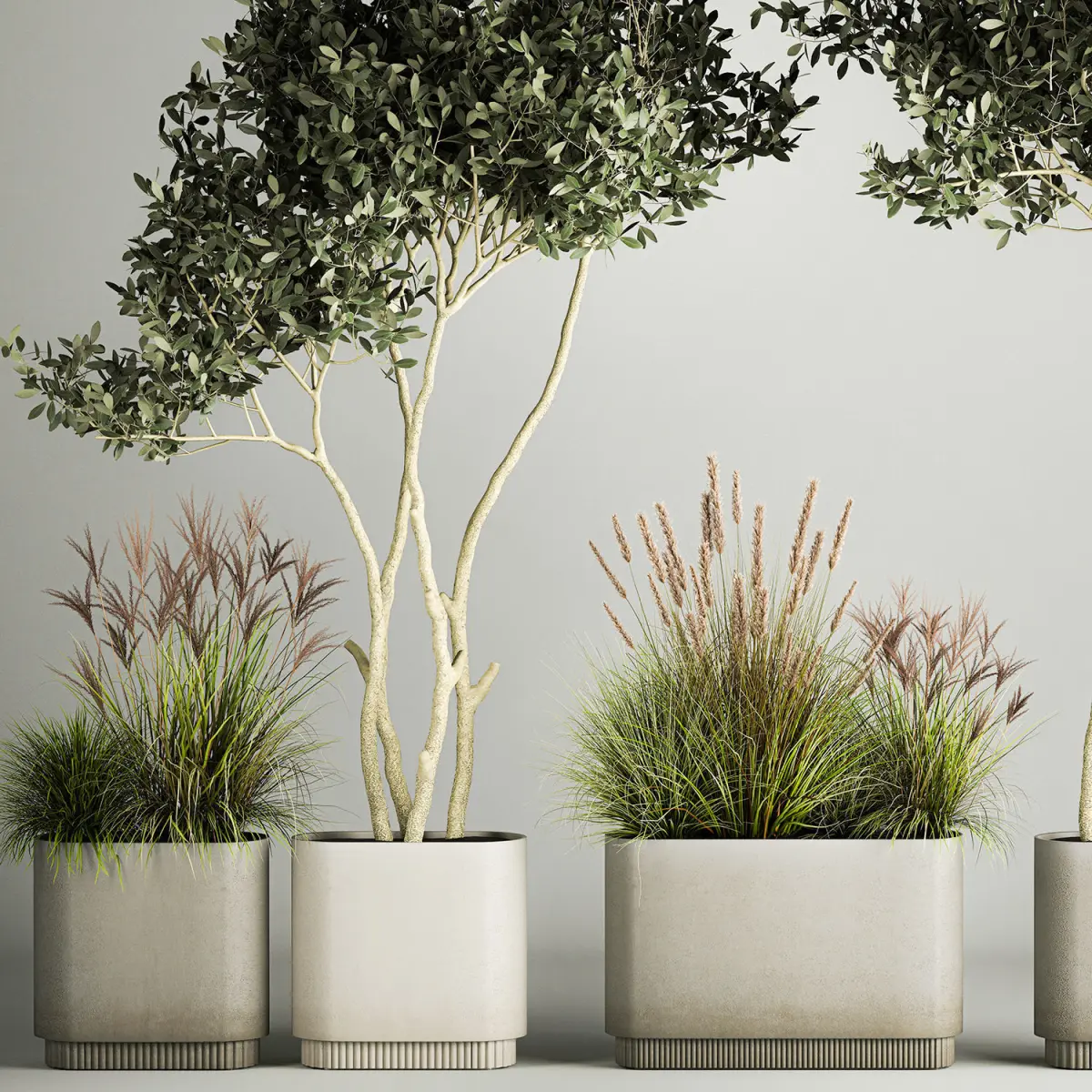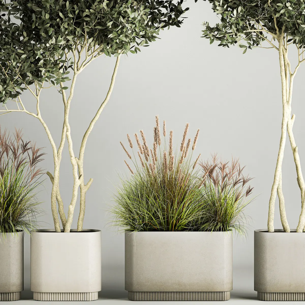 A collection of plants in concrete vases and pots for interior and exterior decor.Plants for landscape design.Concrete, pot, flowerpot, outdoor, decorative, stylishOlea - Olive, OliveOlive tree - European olivedecorative trees in pots, trees in flowerpots.Trees for street decor, public areas and shopping centersPampas grass, reeds, flower bed, bushes, landscaping, grass, bush, flower bed.Wildflowers