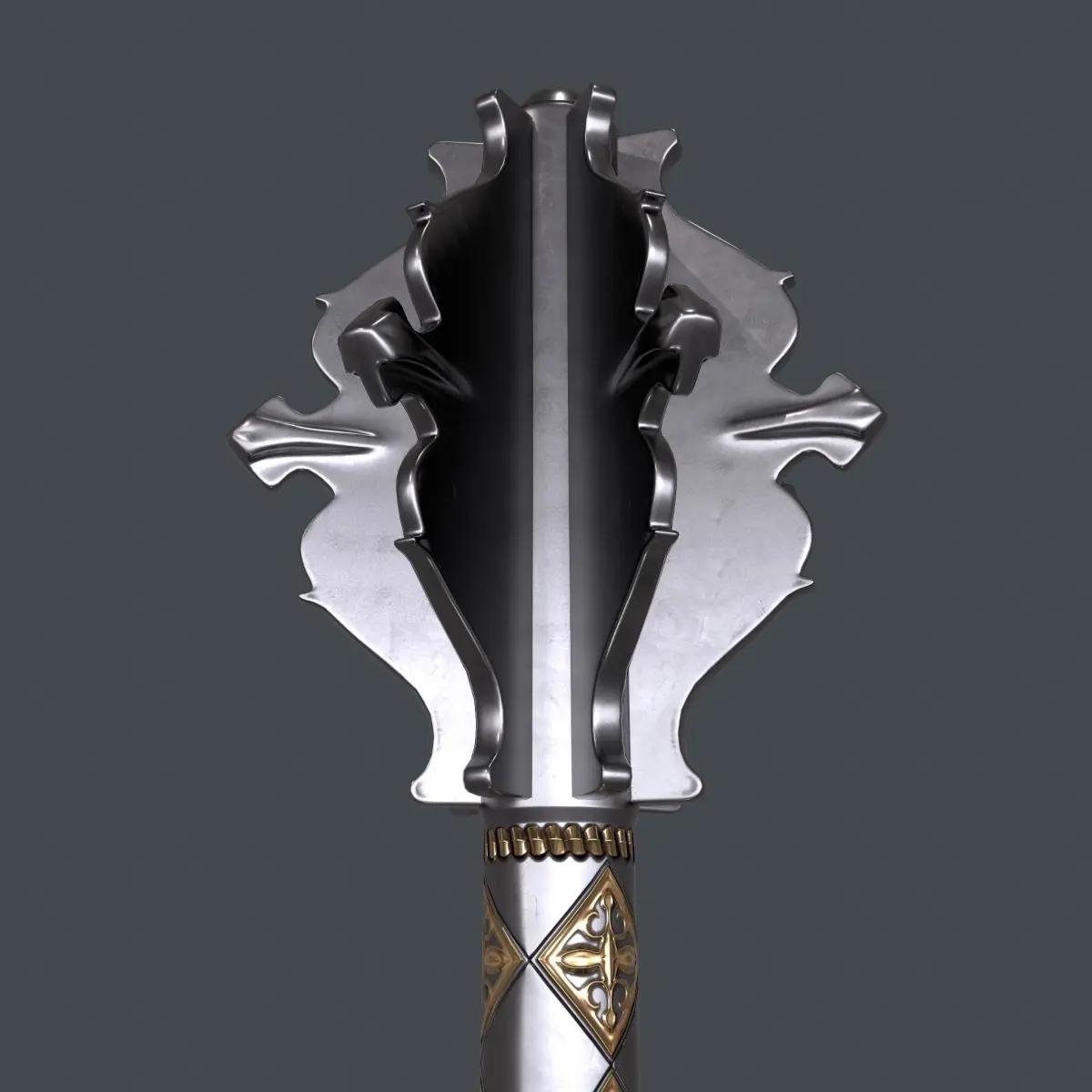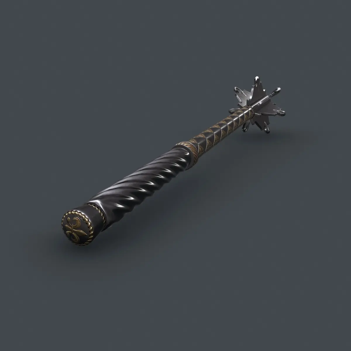 An ornamented - ceremonial mace. The design is inspired from real world exhibits. It is a steel weapon from 1550's . The shaft is engraved with gold.The model is low-poly, game-ready. There is a full set of PBR textures (metalness workflow) that can be implemented for VR and AR :Albedo - 4096x 4096 AO - 4096x 4096Normal - 4096x 4096